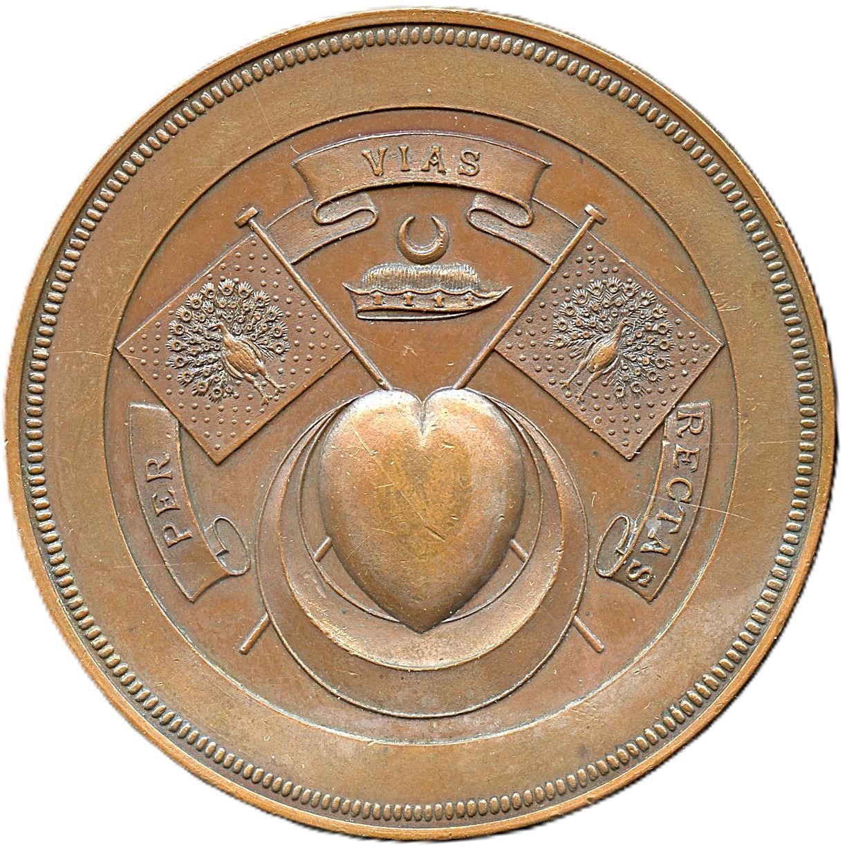 An appealing pattern medal, likely produced around 1888 when Burma was made an Indian province under Frederick Hamilton-Temple-Blackwood as Viceroy of India. Pudd-884.1.4. 52mm. The reverse is lacking the inscriptions of the issued medals. AU/Unc, exhibiting a bit of verdigris. From the Geoffrey Bell Collection.