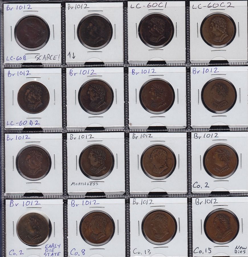 Bust & Harp Lot of 16 Tokens. Includes: BR 1012, VG-VF, various Courteau numbers. 16 Pcs.