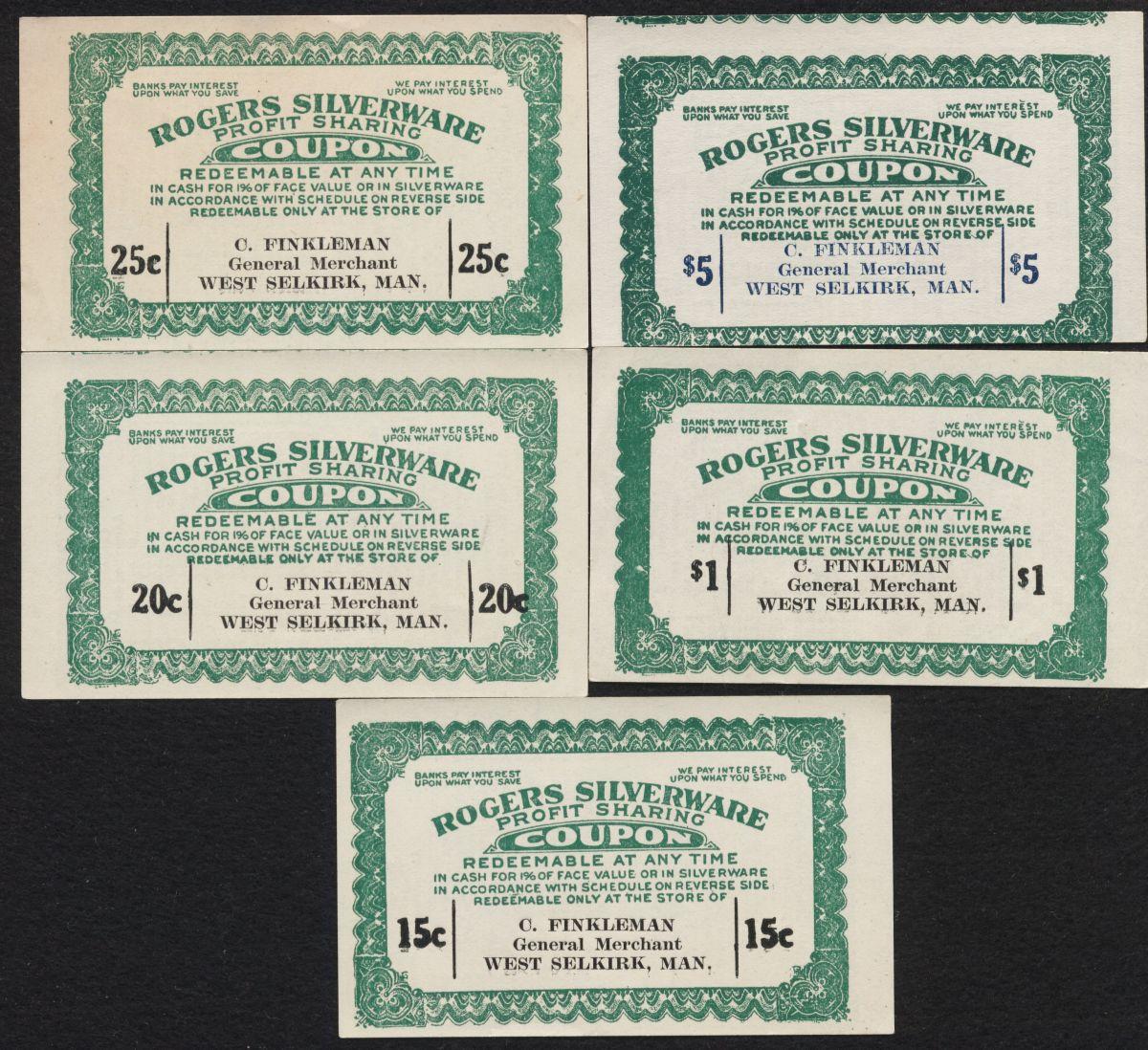 West Selkirk, Manitoba, 15, 20, 25 cents, $1.00 and $5.00, Rogers Silverware Coupons.*