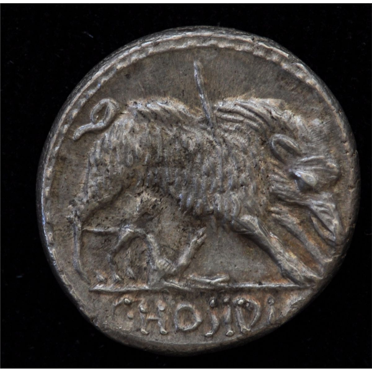 C. Hosidius C.f. Geta (68BC) - AR-Denarius Obv: Diad. and dr. bust of Diana r., bow and quiver over shoulder, GETA before and III VIR behind. Rev: Wild boar r., attacked by hound, pierced by a spear. C.HOSIDI 4.1 grams S-346.