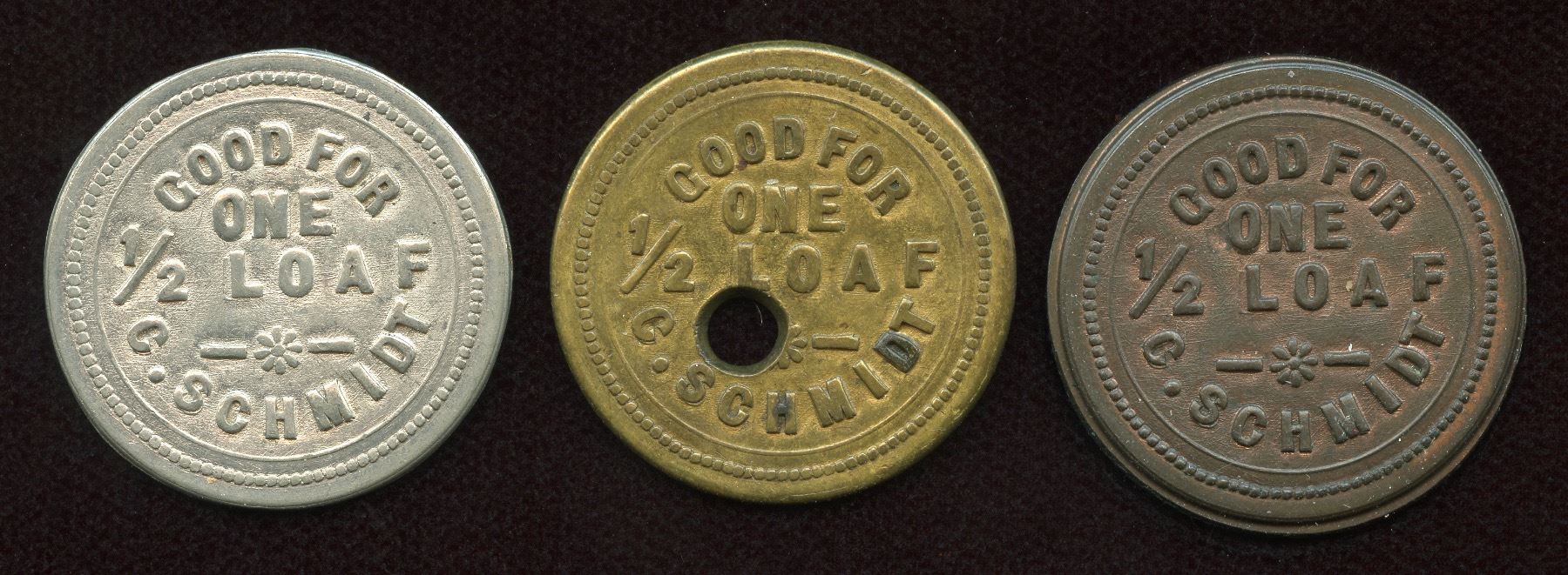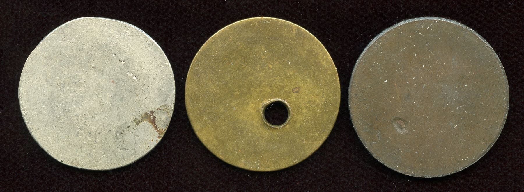 Br. 746, Astwood 1815a, 1/2 Loaf, Pewter, EF; Br. 746, Astwood 1815b, 1/2 Loaf, Brass, Holed, EF; Br. 746, Astwood 1815c, 1/2 Loaf, Copper, EF. 2 Pcs.
