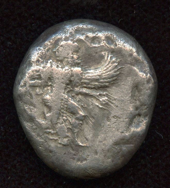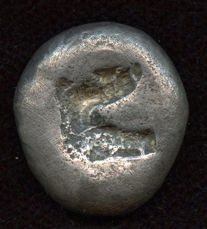 Winged female figure running r., head l. Rev: Crude rectangular object (baetyl?) within incuse square. Konuk 8; VF, obv off struck; Ex: ANE.