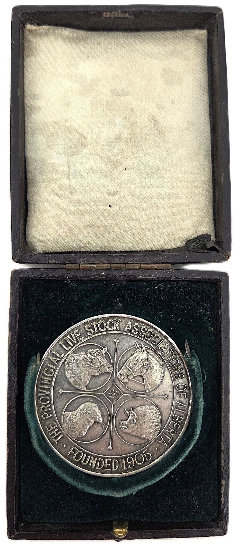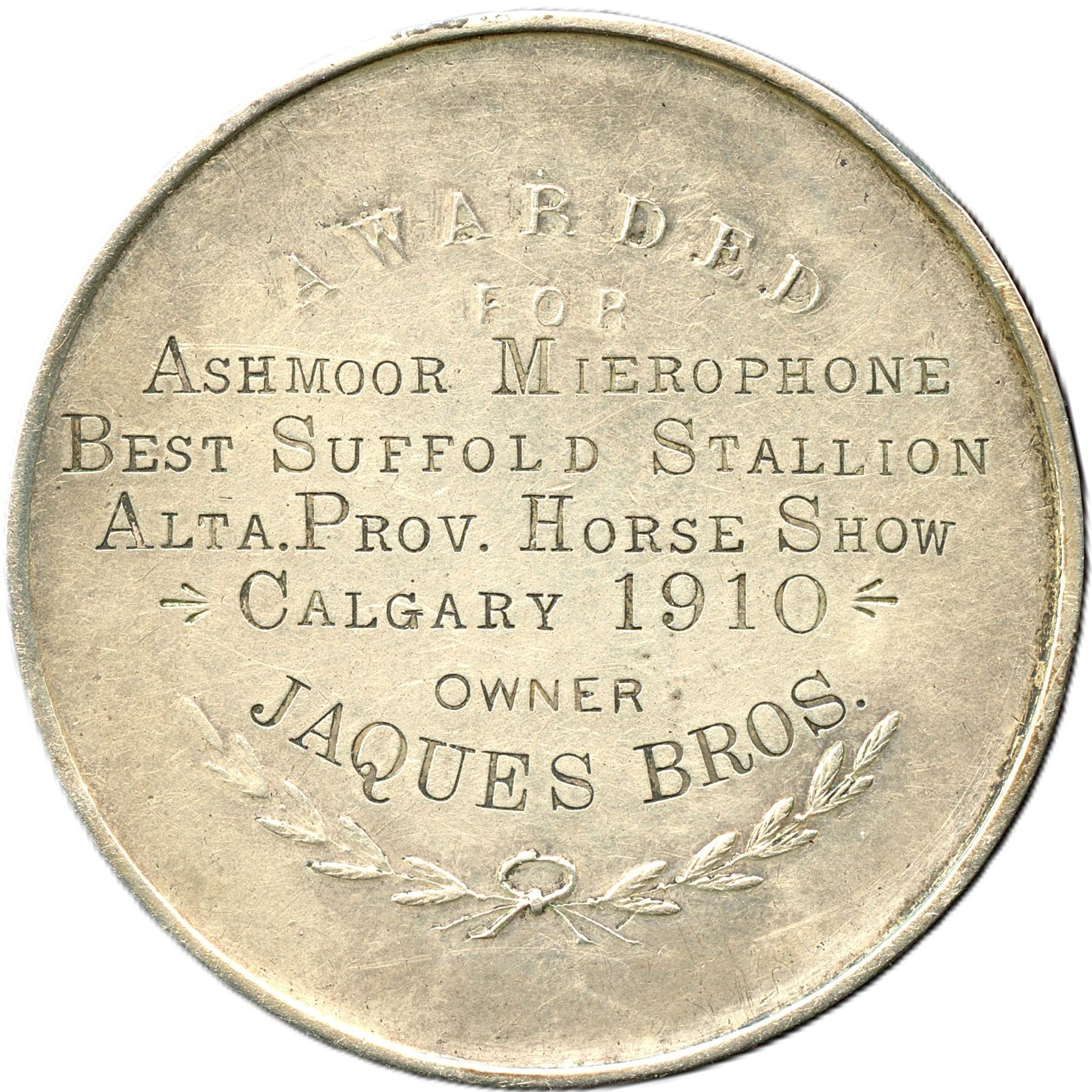 49.8mm, 87.2g (2.6ASW), Awarded For: "Ashmoor Mierophone Best Suffold Stallion Alta. Prov. Horse Show Calgary 1910 Owner Jaques Bros. Housed in its original black paper box with green velvet and white satin interior. Very nice EF. Very Scarce. From the Geoffrey Bell Collection.