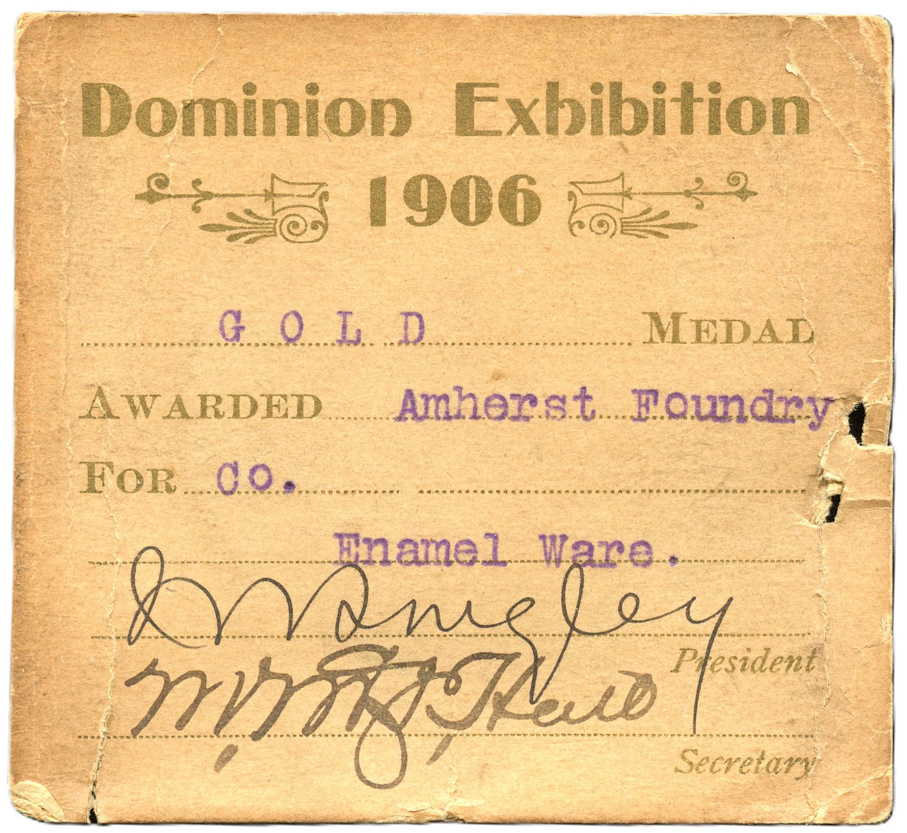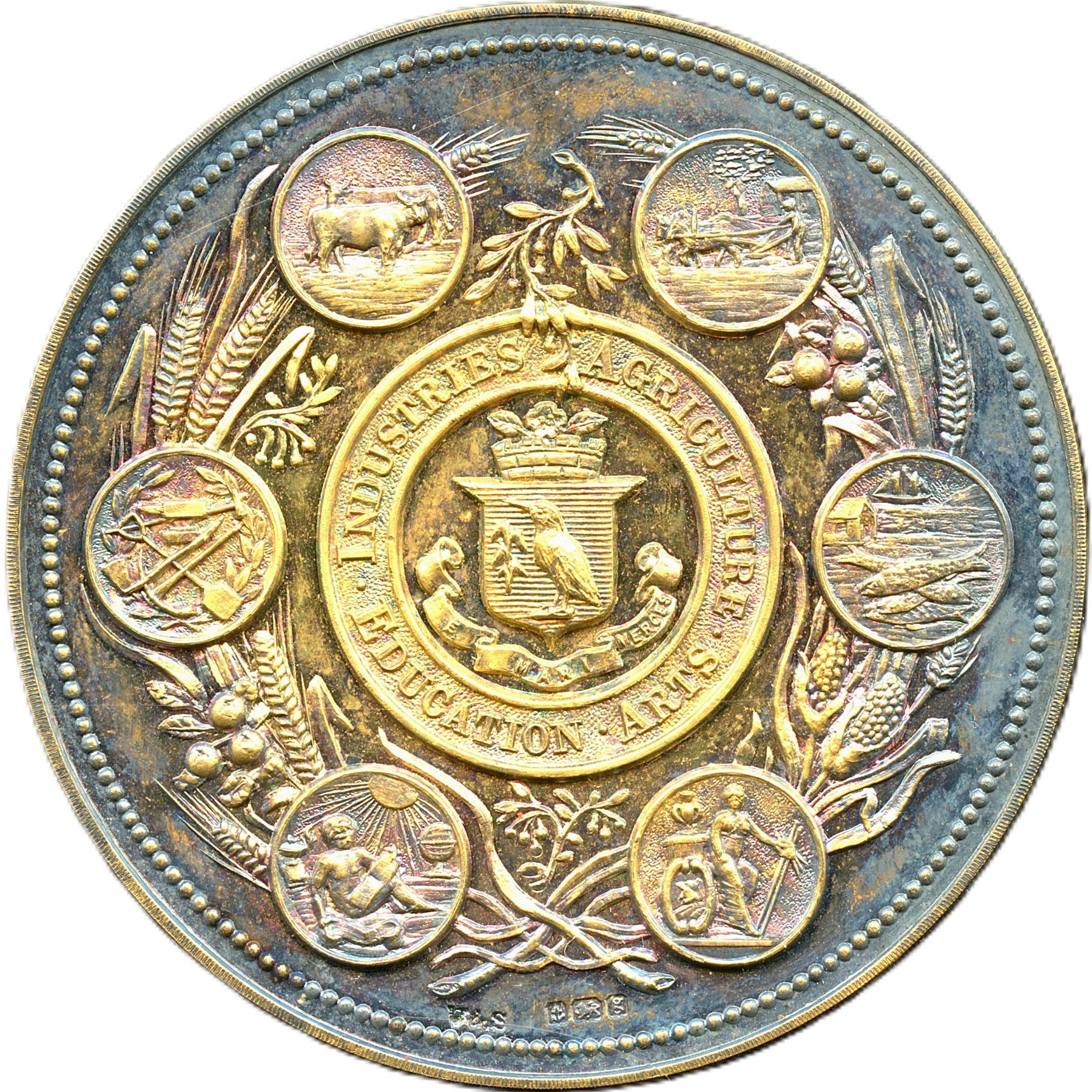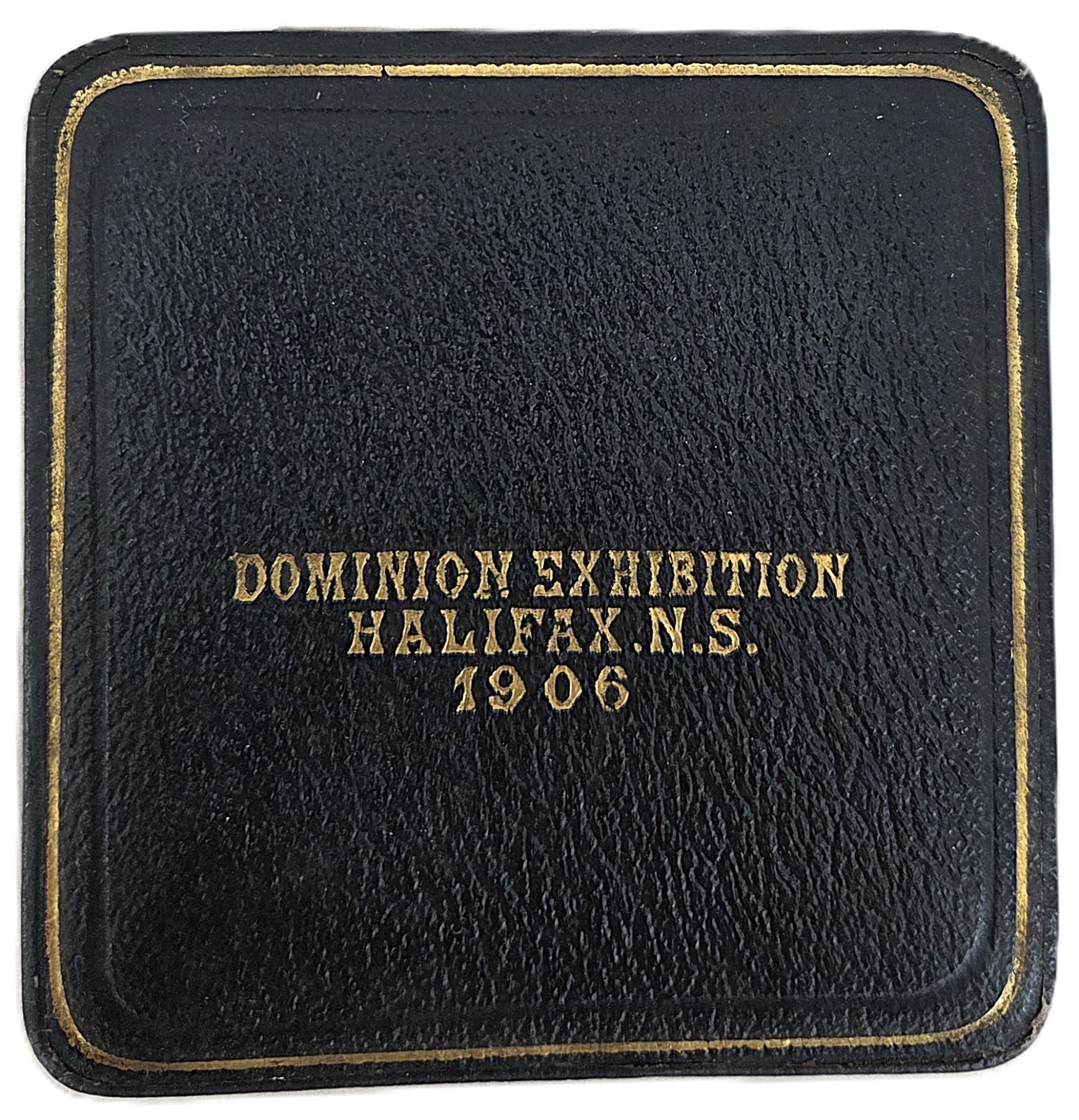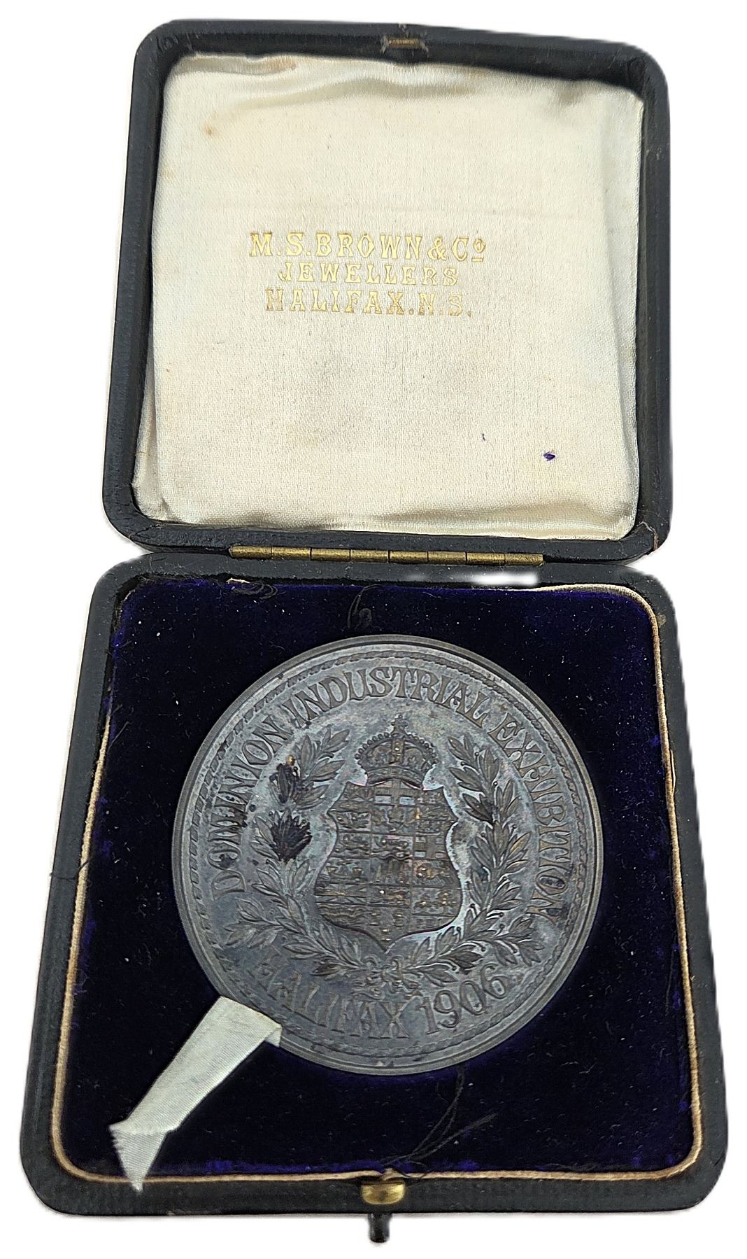 51mm, 64.2g, V&S and hallmarks on One Line. Obverse shows original surfaces with deeply toned gunmetal-blue patina over Gilt. Reverse shows original surfaces with reflective surfaces violet patina on the edges Gilt shows well in the centre. Housed in its original black paper wooden box with Dominion Exhibition Halifax N.S. 1906 (in gold lettering) with purple velvet and white satin interior (M.S. Brown & Co. Jewellers Halifax N.S.). With original certificate Awarded to "Gold Medal Amherst Foundry Co. For Enamel Ware". Scarce. UNC. 1pc. From the Geoffrey Bell Collection.