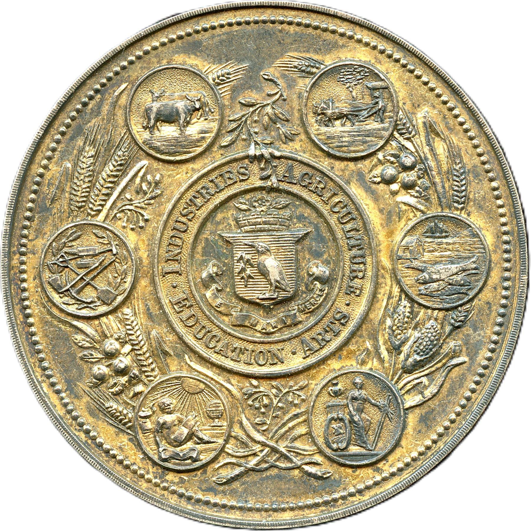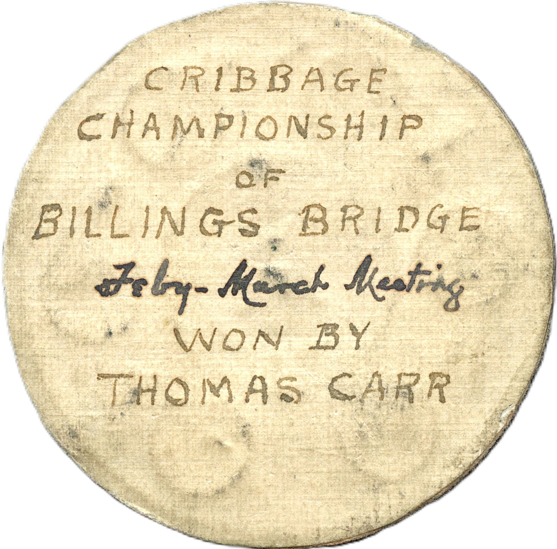 56mm, 65.9g, Gilt mostly intact, With cardstock ticket "Cribbage Championship Of Billings Bridge Feby-March Meeting Won By Thomas Carr", No maker's hallmark, EF. Scarce. 1pc. From the Geoffrey Bell Collection.