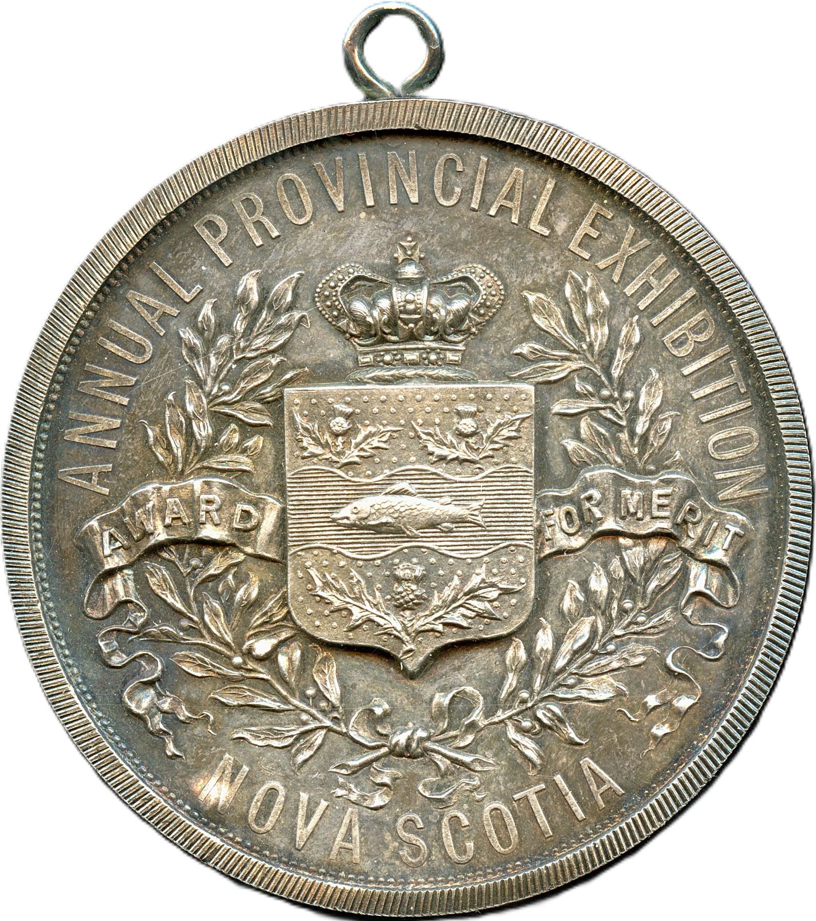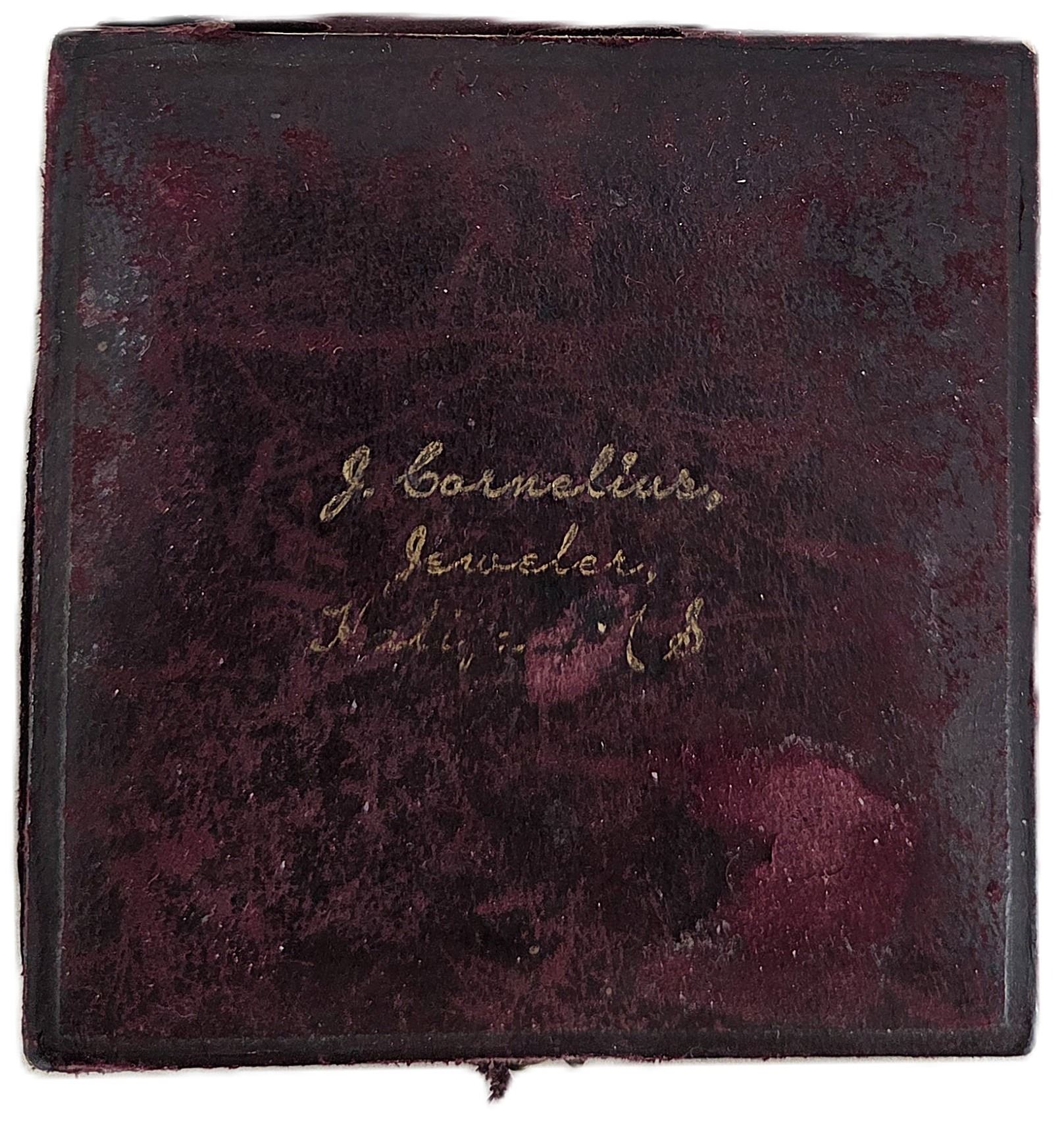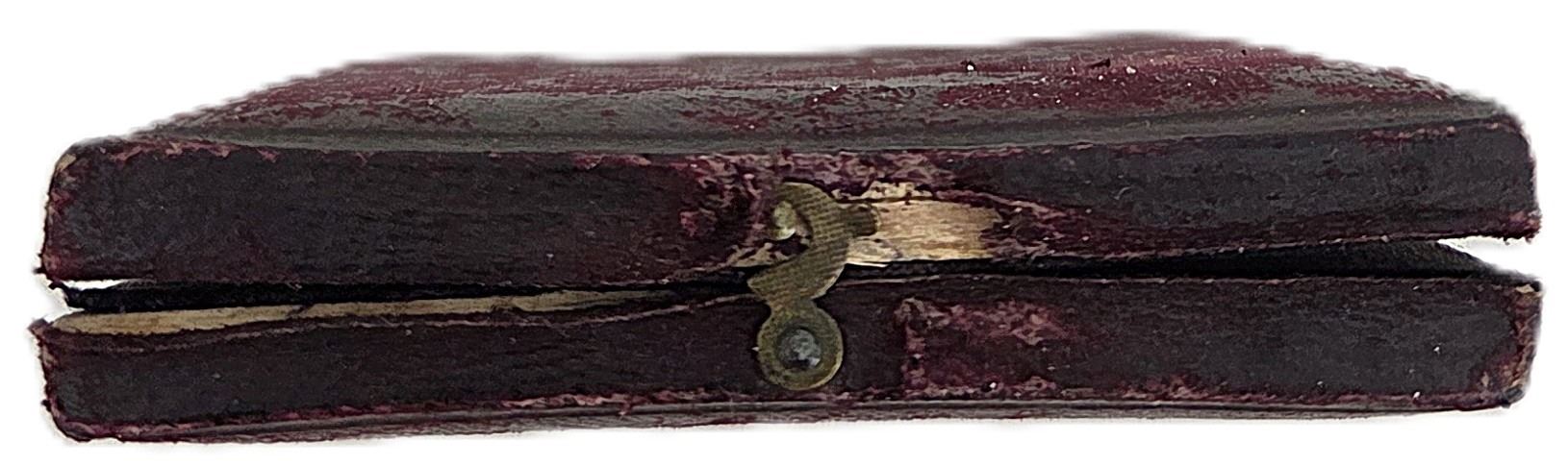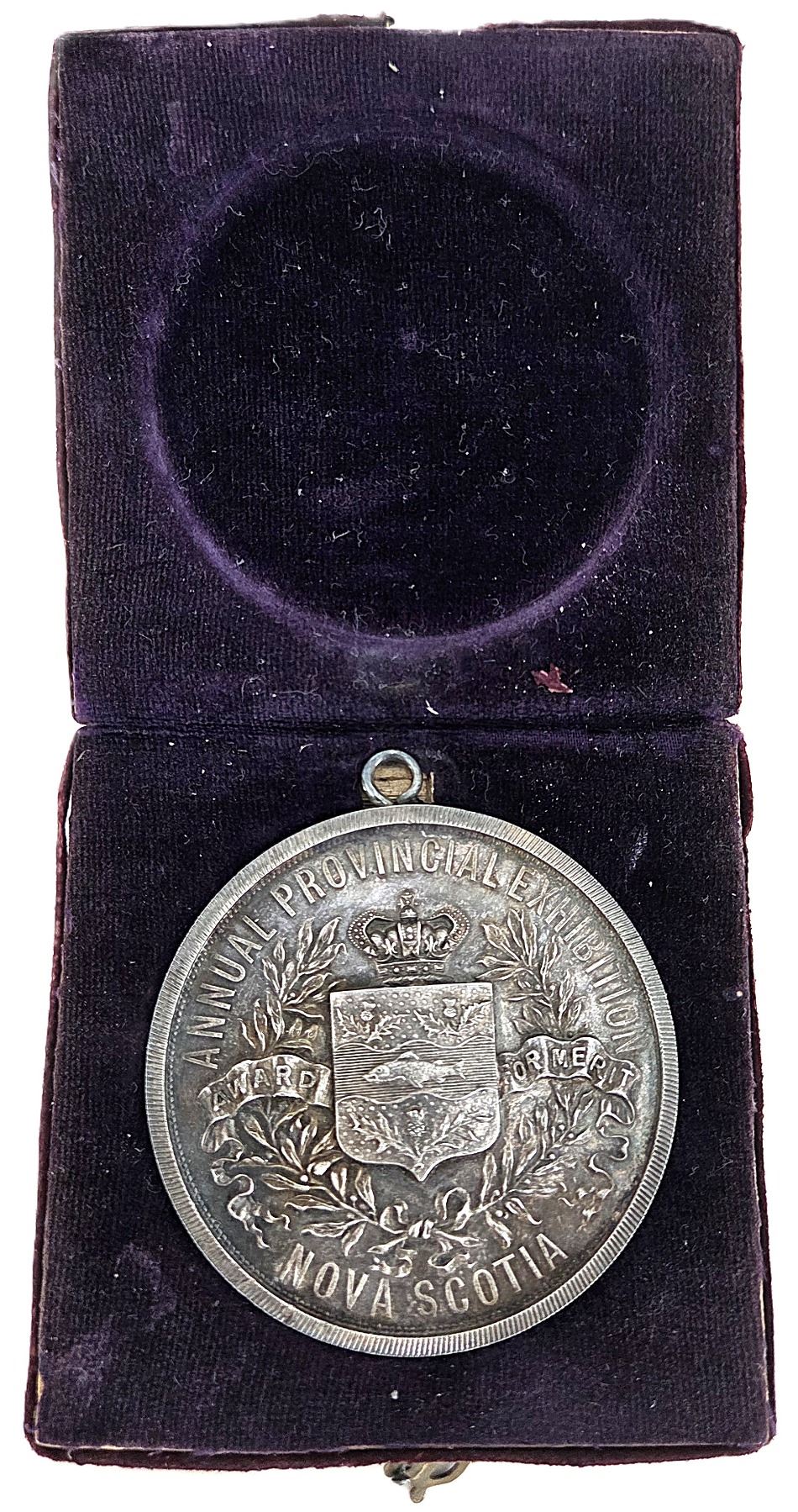 56mm, 72.8g, Housed in its original maroon leather box with blue velvet interior. Case is complete but in rough shape, A suspension loop was added to the medal, Original surfaces with violet patina over reflective fields, a small a hole is present at 5 o'clock. UNC. 1pc. From the Geoffrey Bell Collection.