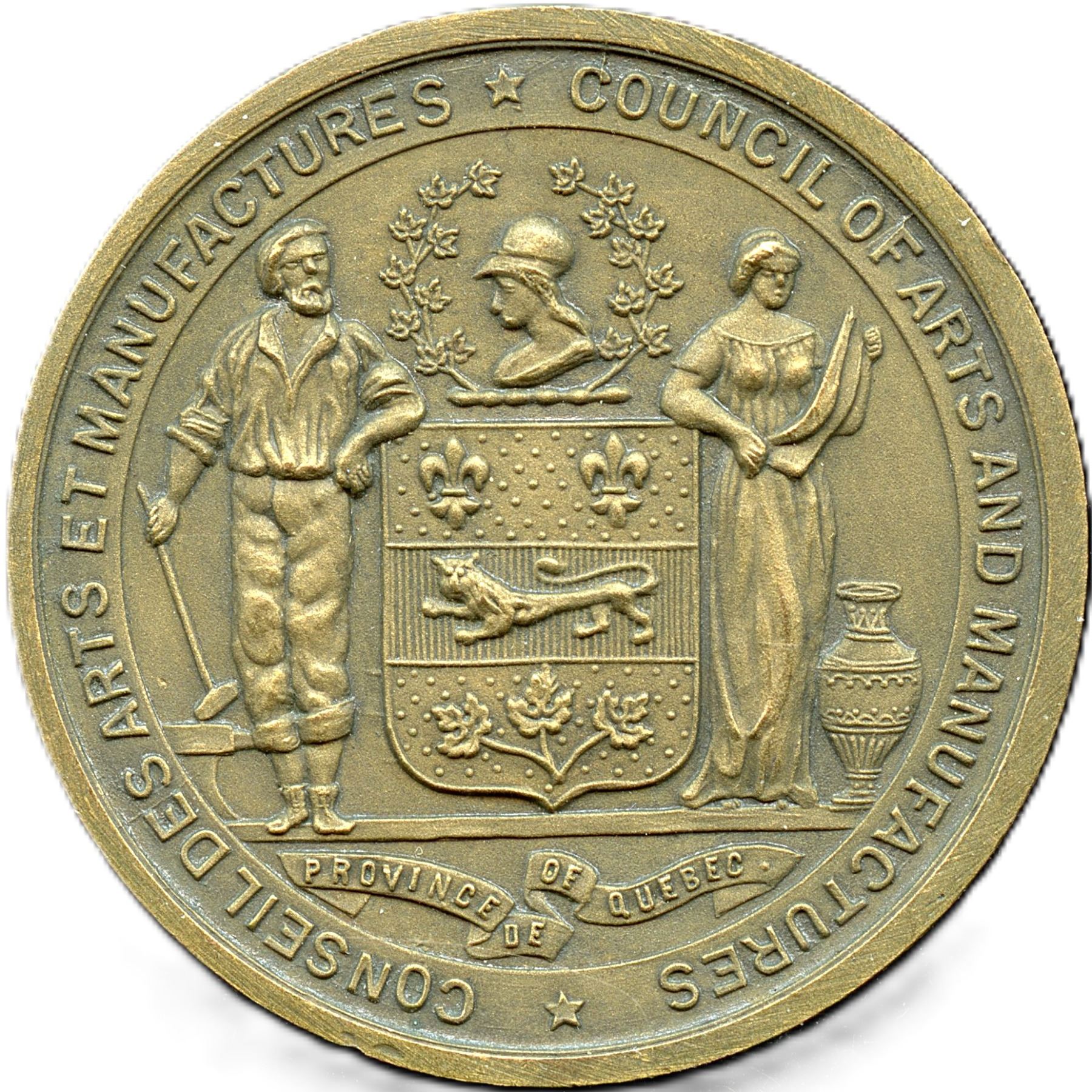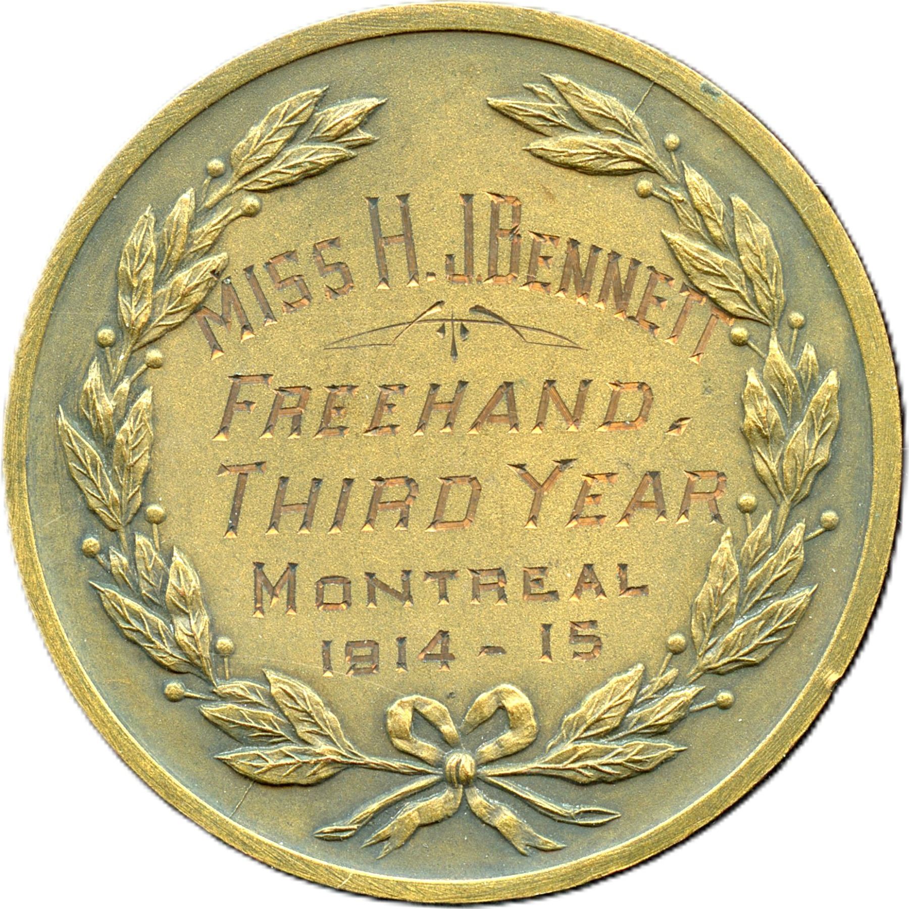 38.8mm, 26.8g, Awarded To (on reverse): "Miss H. J. Bennett Freehand Third Year Montreal 1914-15", Medal alignment, Original Matte surfaces, with yellow-gold and only a few tiny marks without any trace of the underlying copper. Not listed in Gilt Copper, UNC. 1pc. From the Geoffrey Bell Collection.