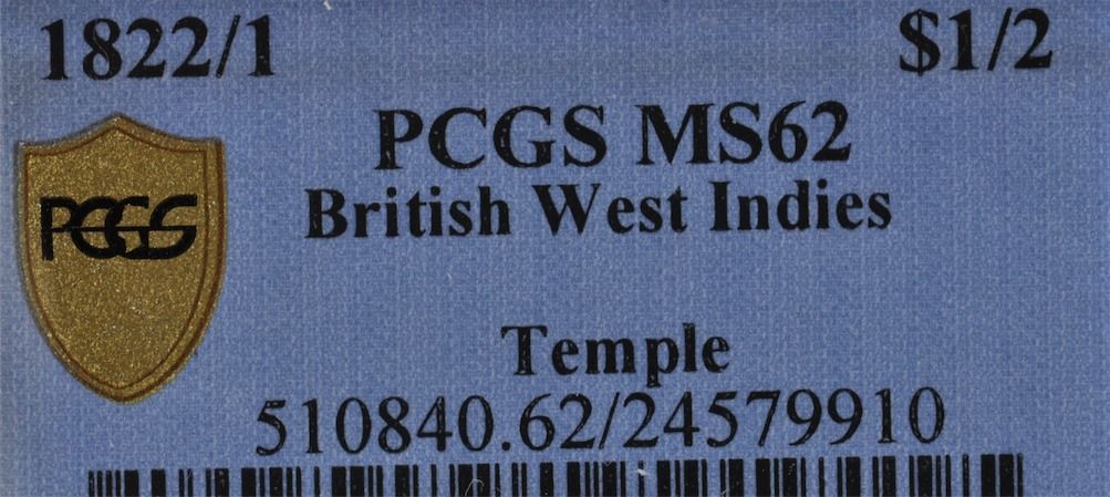 CH NC-1A2, 1822/1 British West Indies Half Dollar Token - PCGS MS62, suberp example. Ex:Temple.