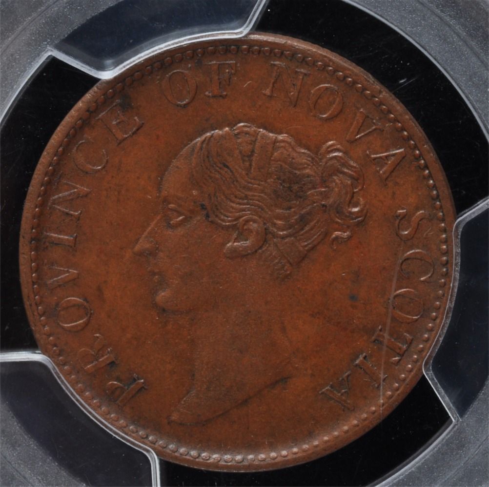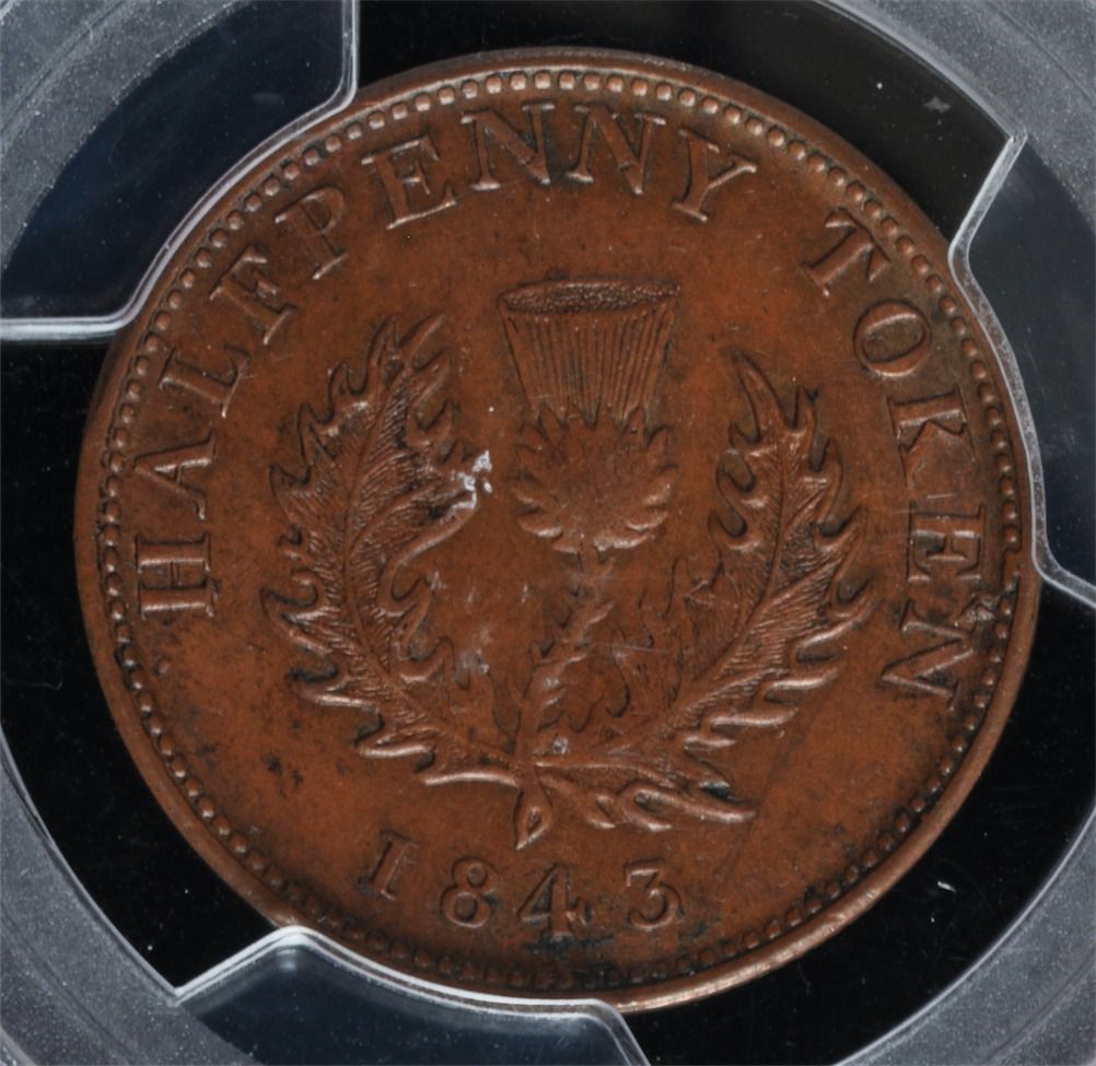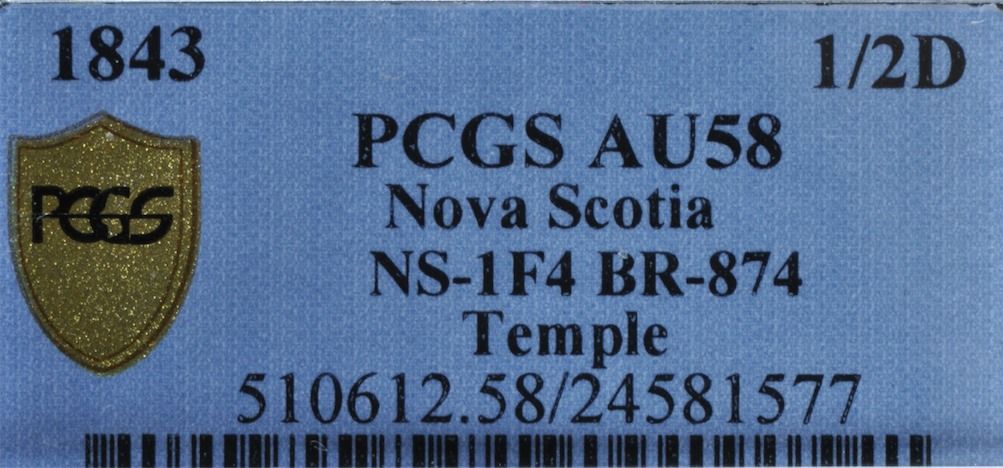 CH NS-1F4 - BR 874, 1843 Nova Scotia Half Penny Token, PCGS AU58. Ex:Temple
