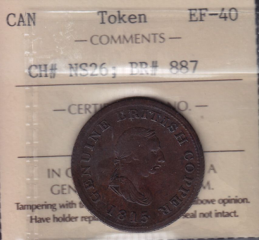 CH NS-26. BR 887, 1815 Genuine Copper, ICCS EF-40. Diagonally reeded.