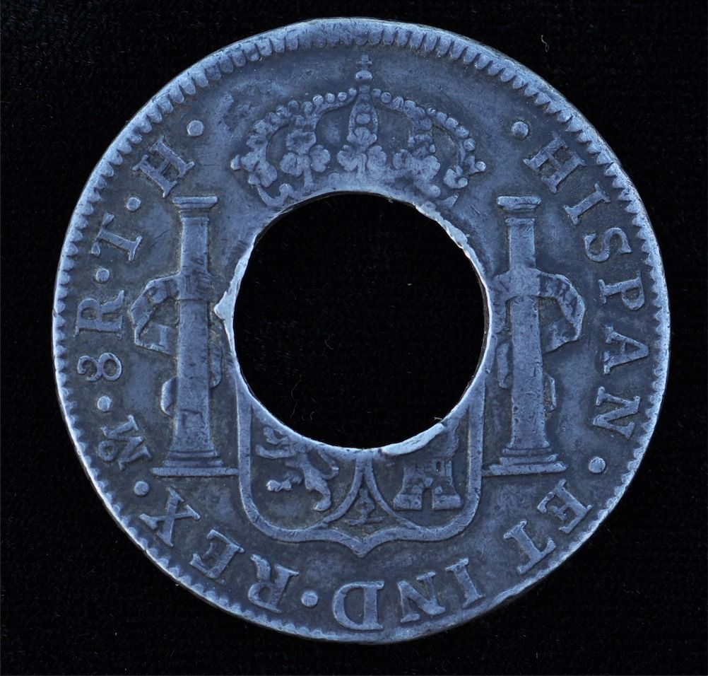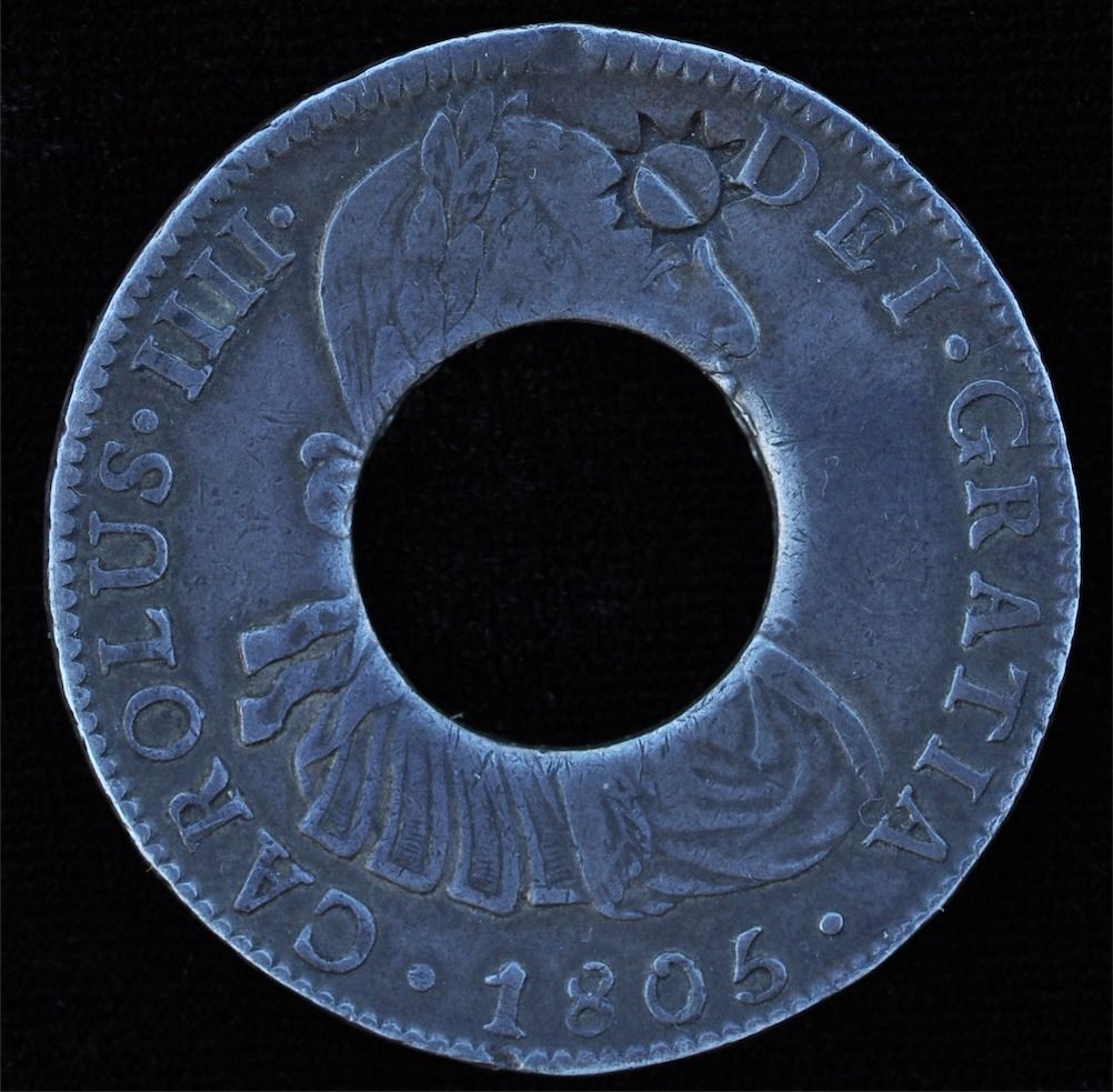 CH PE-1A1, PEI Holey Dollar, 1805 - Spanish eight real pieces were commonly used as currency on Prince Edward Island in the early 1800's. The newly minted Governor found that silver coinage was all being used to purchase goods in Halifax and Saint John and thus leaving a shortage of specie on the Island. In order to keep coinage on the Island, he cleverly had the center (dump) cut out of the eight real pieces valued at 1 shilling and the resulting ring valued at 5 shillings. The original coin was only worth 5 shillings in Halifax and Saint John. These specimens are interesting in that they were emergency money, local tokens, very early Canadian coinage, so collectors in various fields show interest in these fascinating coins. Faulkner D-3, Silver, 1805, C/S on forehead.