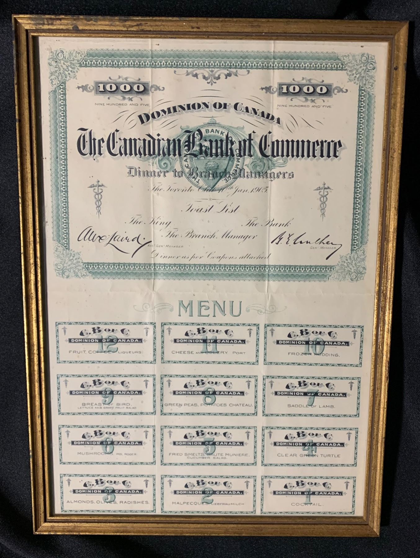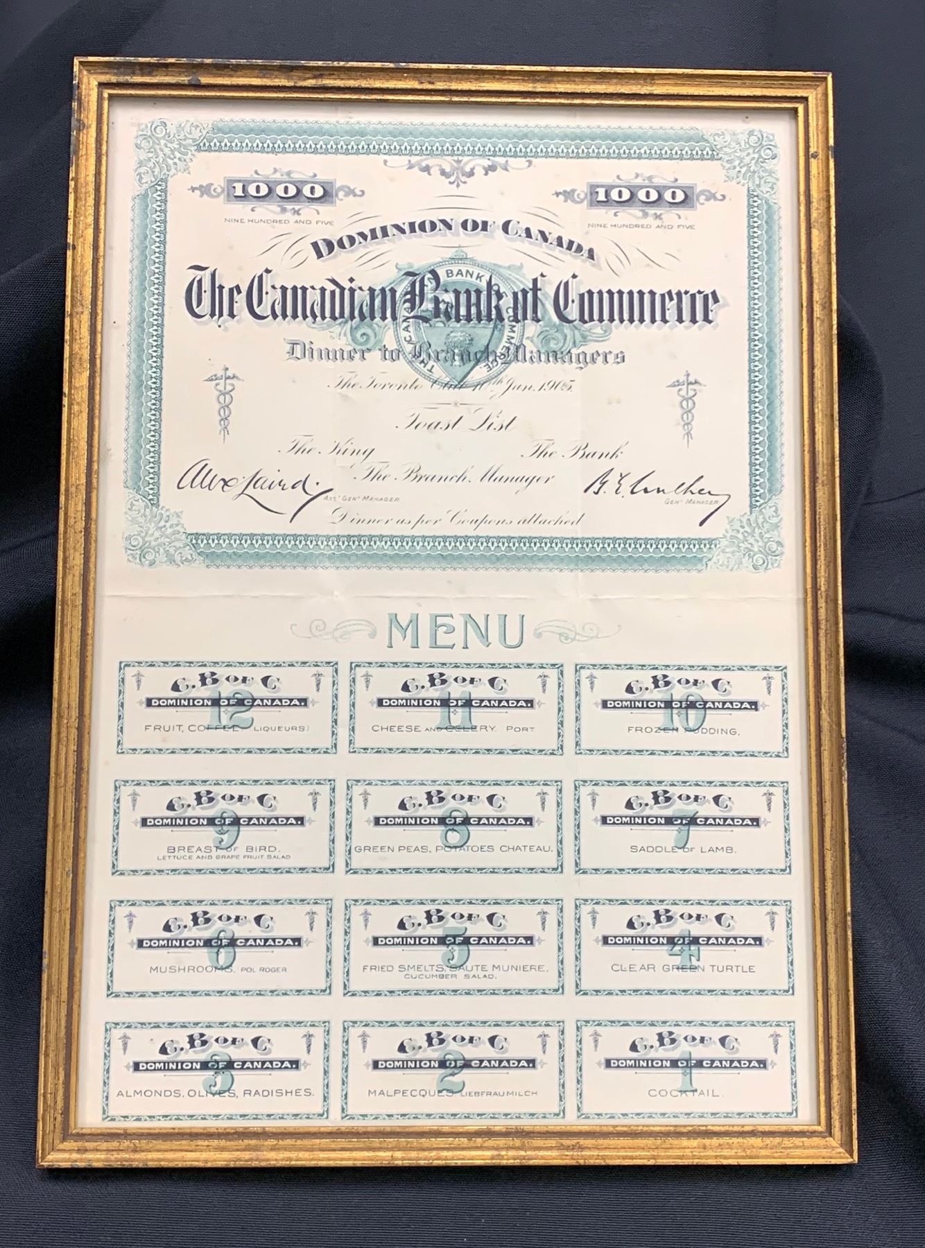 Dominion of Canada, The Canadian Bank of Commerce, Dinner to Branch Managers, The Toronto Club 10th Jan. 1905.  Menu in the style of a Canadian bond. A must see and possibly unique.  Framed in gold flecked frame. CIBC Memorabilia - From the personal collection of Dennis M Carpenter, former Executive with the Canadian Imperial Bank of Commerce