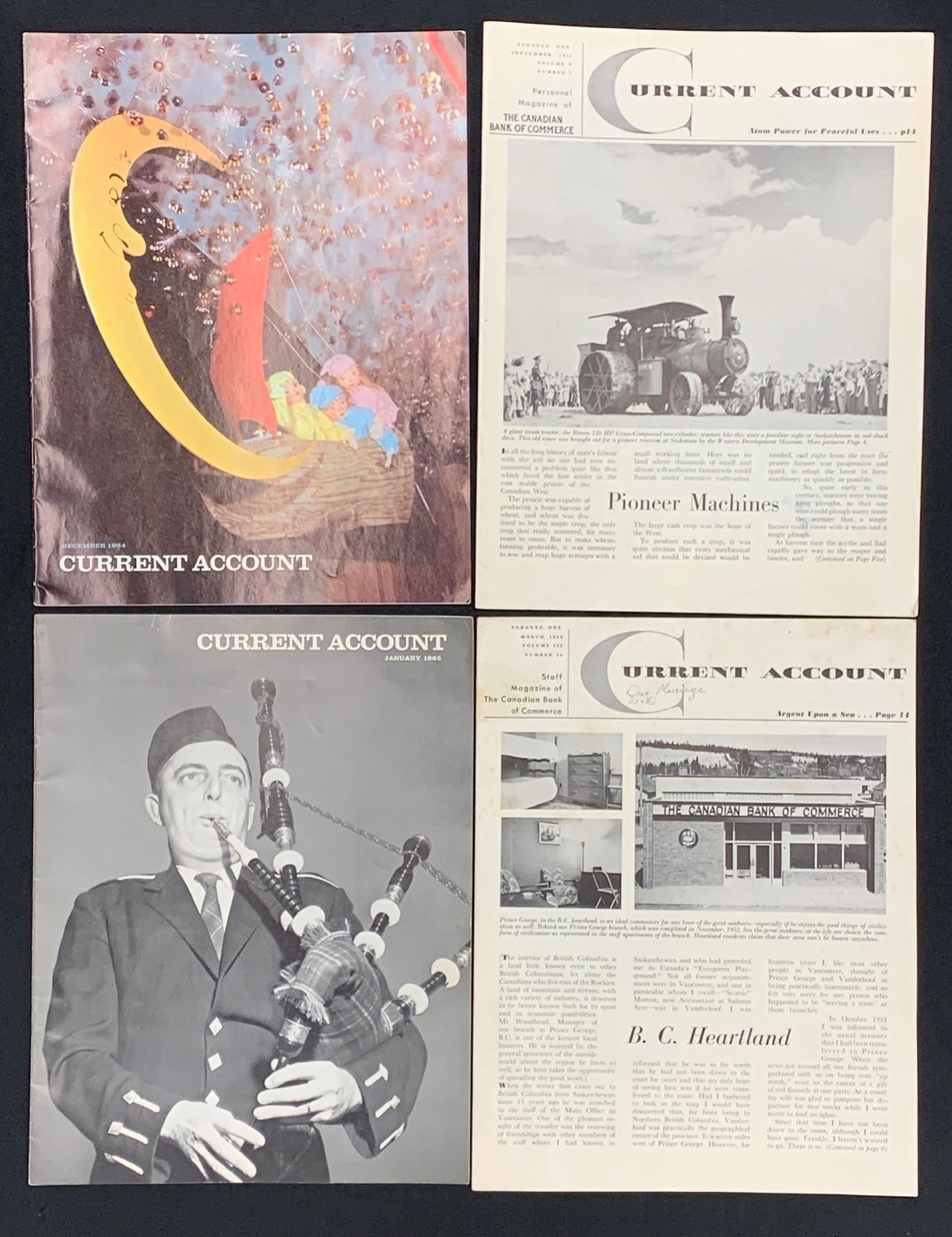 4 Issues of CIBC Current Account Employee Magazines. 1954 Issue - pg. 10 Marriage Notice, 1955 Issue - pg. 8 photo, 1964 pg. 7 article by D. M. Carpenter "Girls; Colour, Customers, 1965 Issue - pg. 20 Photo and honourable mention. CIBC Memorabilia - From the personal collection of Dennis M Carpenter, former Executive with the Canadian Imperial Bank of Commerce