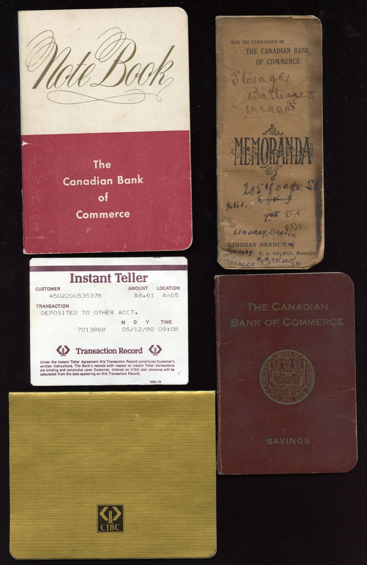 6 Piece Lot including bank books, notebook, cheque book from the Canadian Imperial Bank of Commerce. CIBC Memorabilia - From the personal collection of Dennis M Carpenter, former Executive with the Canadian Imperial Bank of Commerce