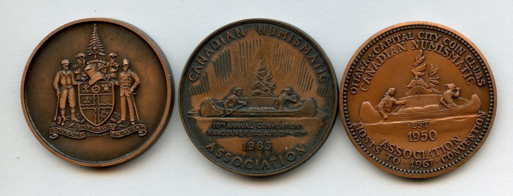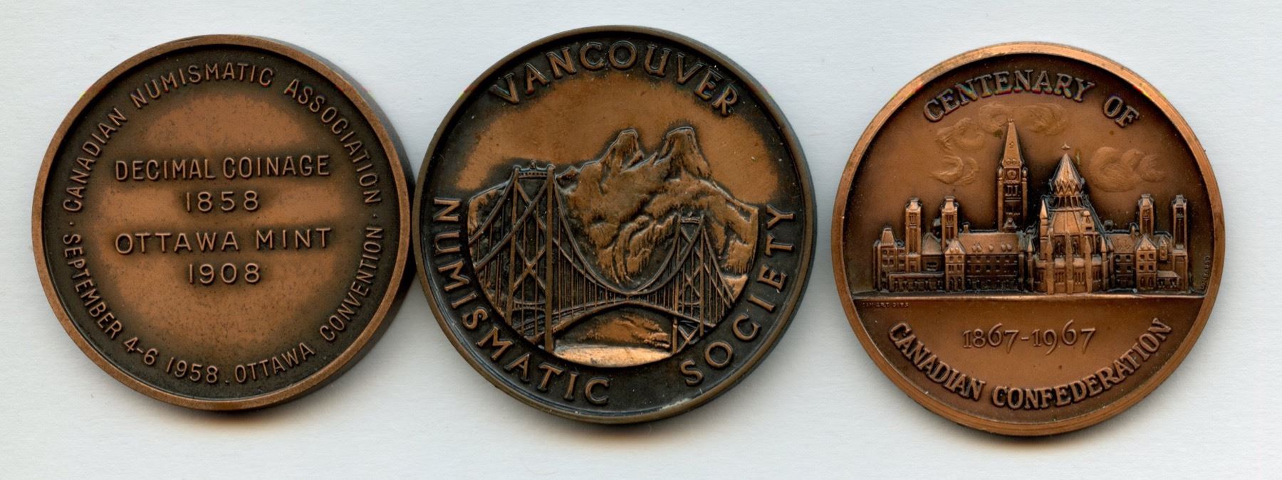 1958 Ottawa bronze, 300 issued; 1963 Vancouver copper, 700 issued; 1967 Ottawa bronze, 1000 issued. 3 pcs.