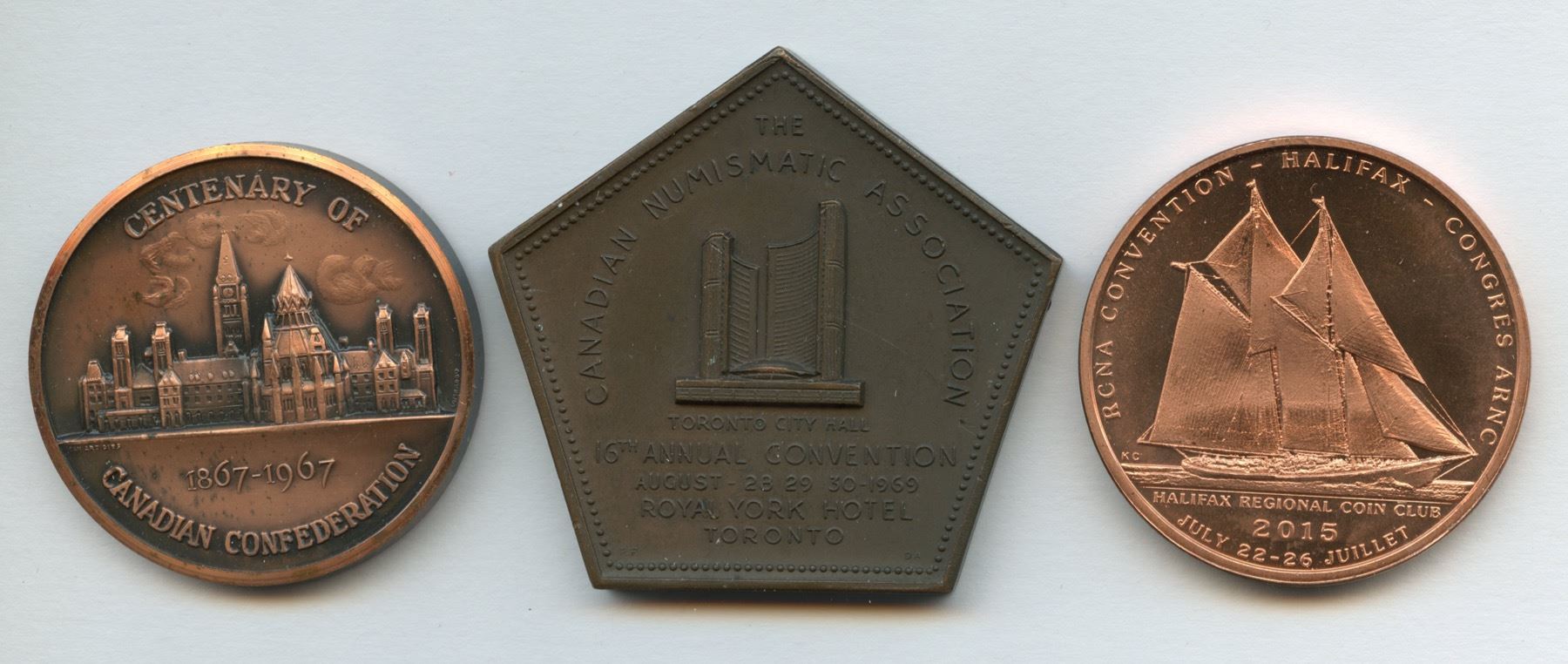 1967 Ottawa bronze, 1000 issued; 1969 Toronto bronze, 980 issued; 2015 Halifax copper. 3 pcs.
