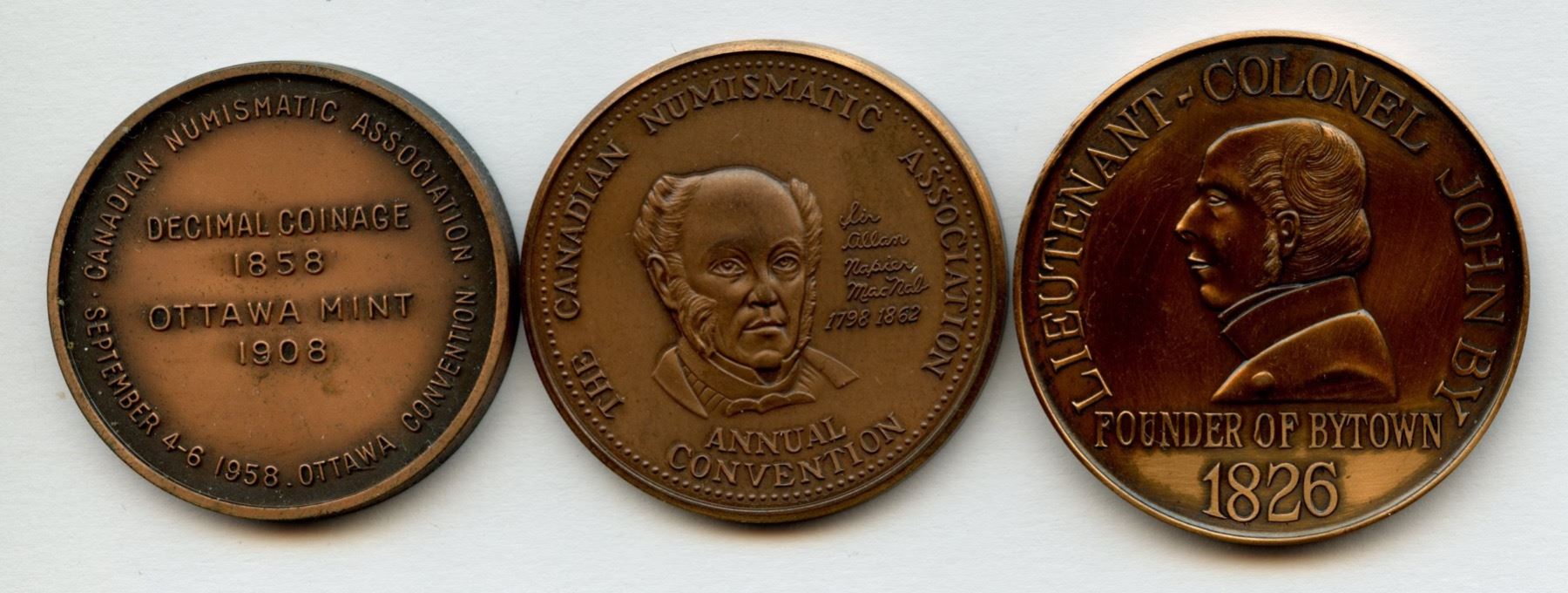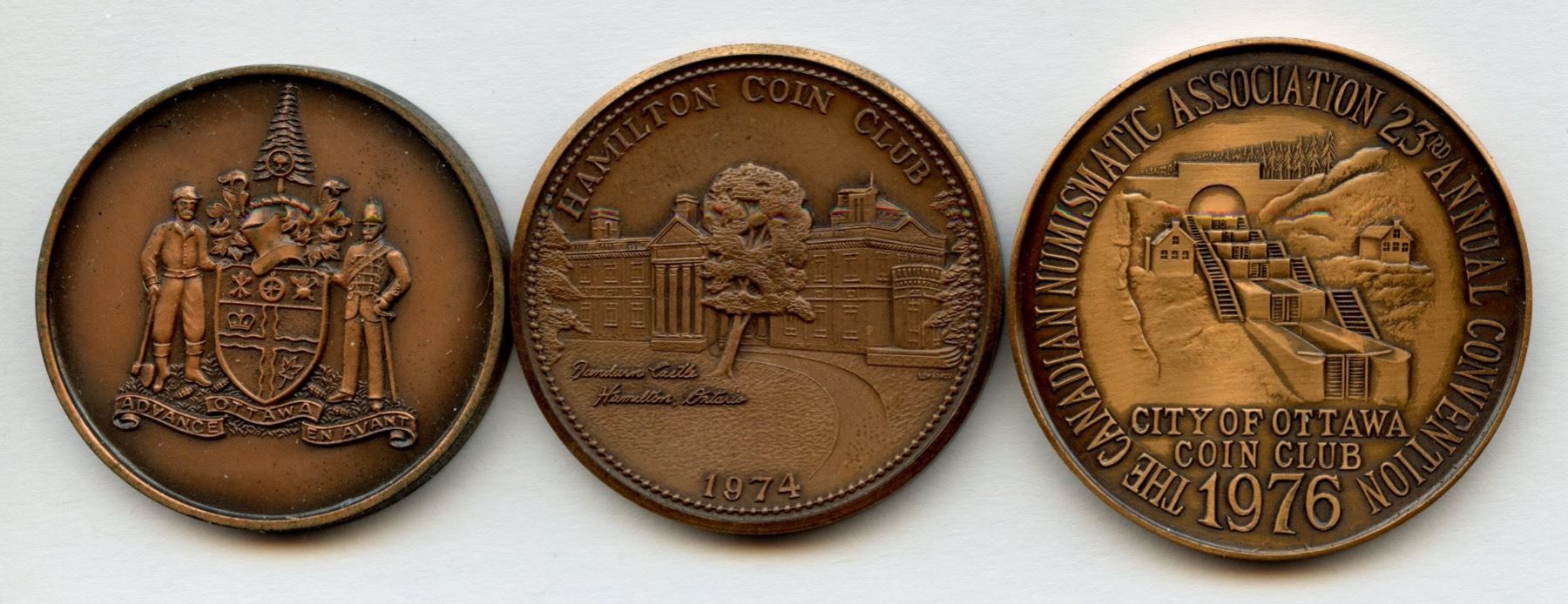 1958 Ottawa bronze, 300 issued; 1974 Hamilton bronze, 400 issued; 1976 Ottawa, bronze, 500 issued. 3 pcs.