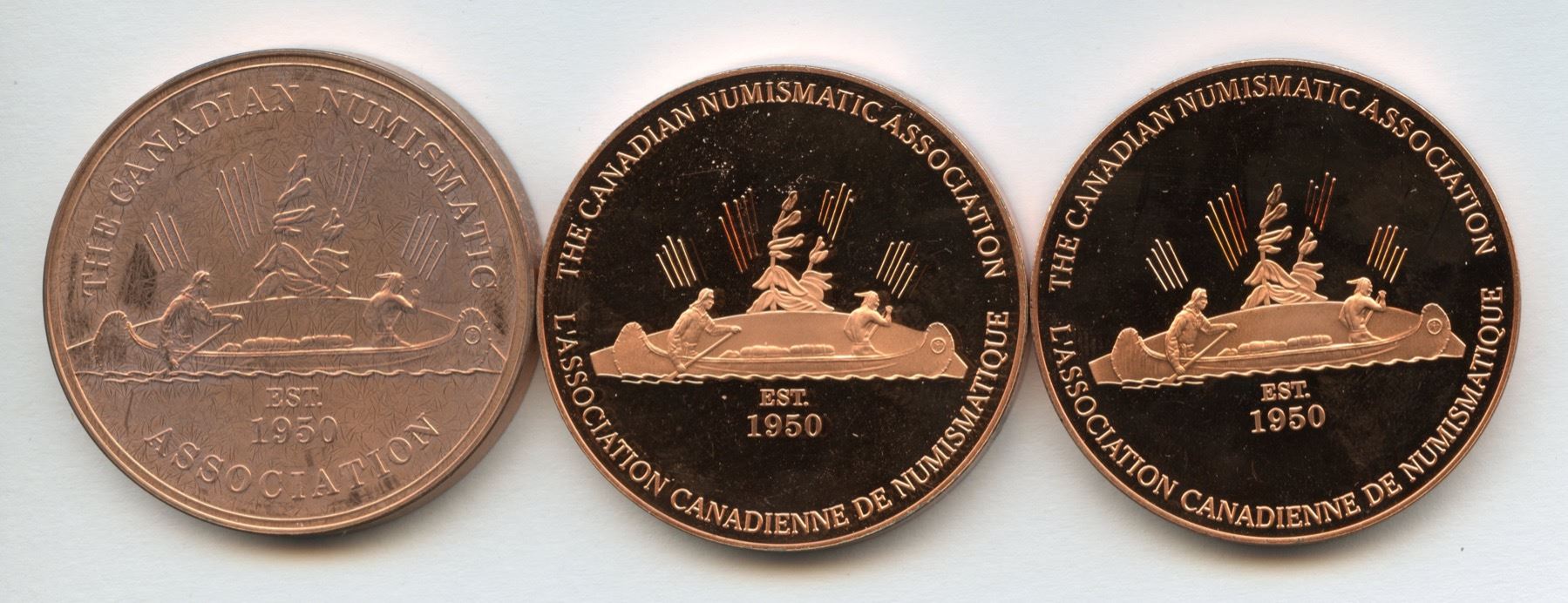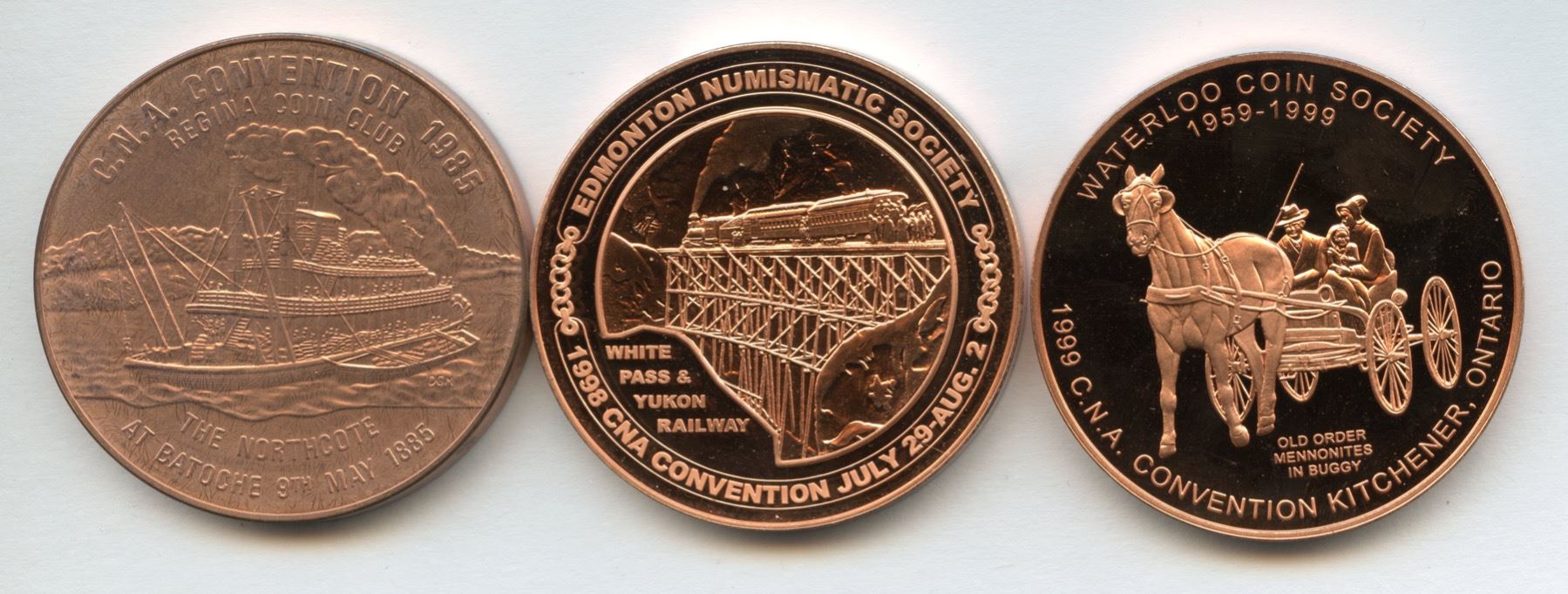 1985 Regina bronze, 375 issued; 1998 Edmonton copper, 162 issued; 1999 Kitchener copper, 175 issued. 3 pcs.