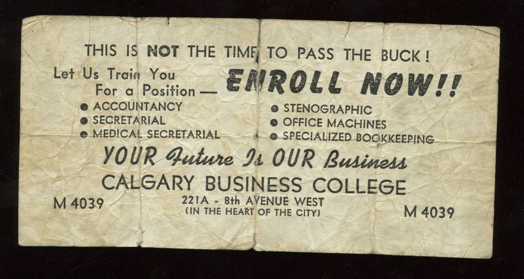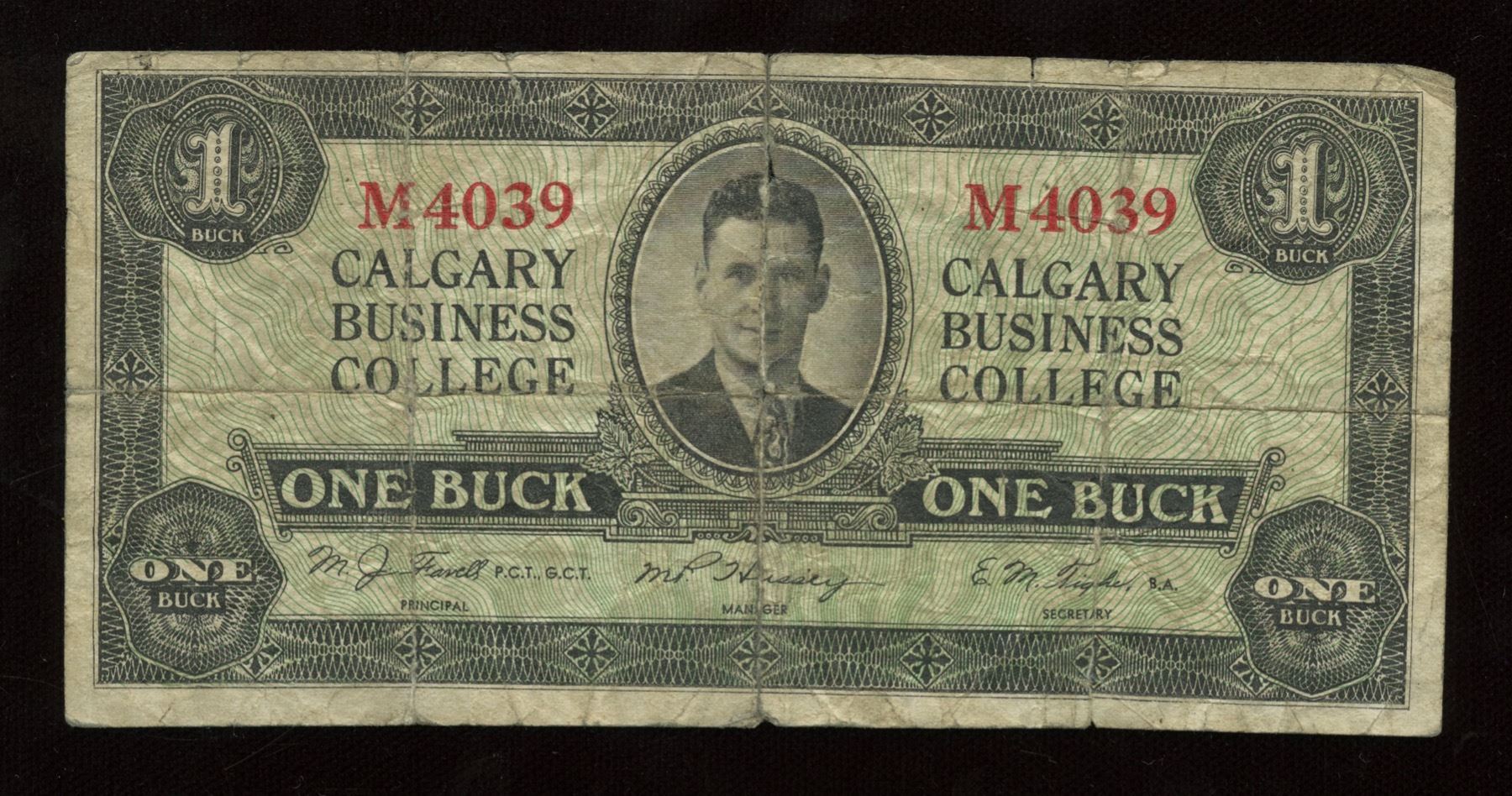 Calgary Business College, Calgary, Alberta, made to look like real Canadian Currency. It is for $1.00. It has advertising on the reverse and was probably used in the 1930's. VG, torn. It is unlisted and scarce.