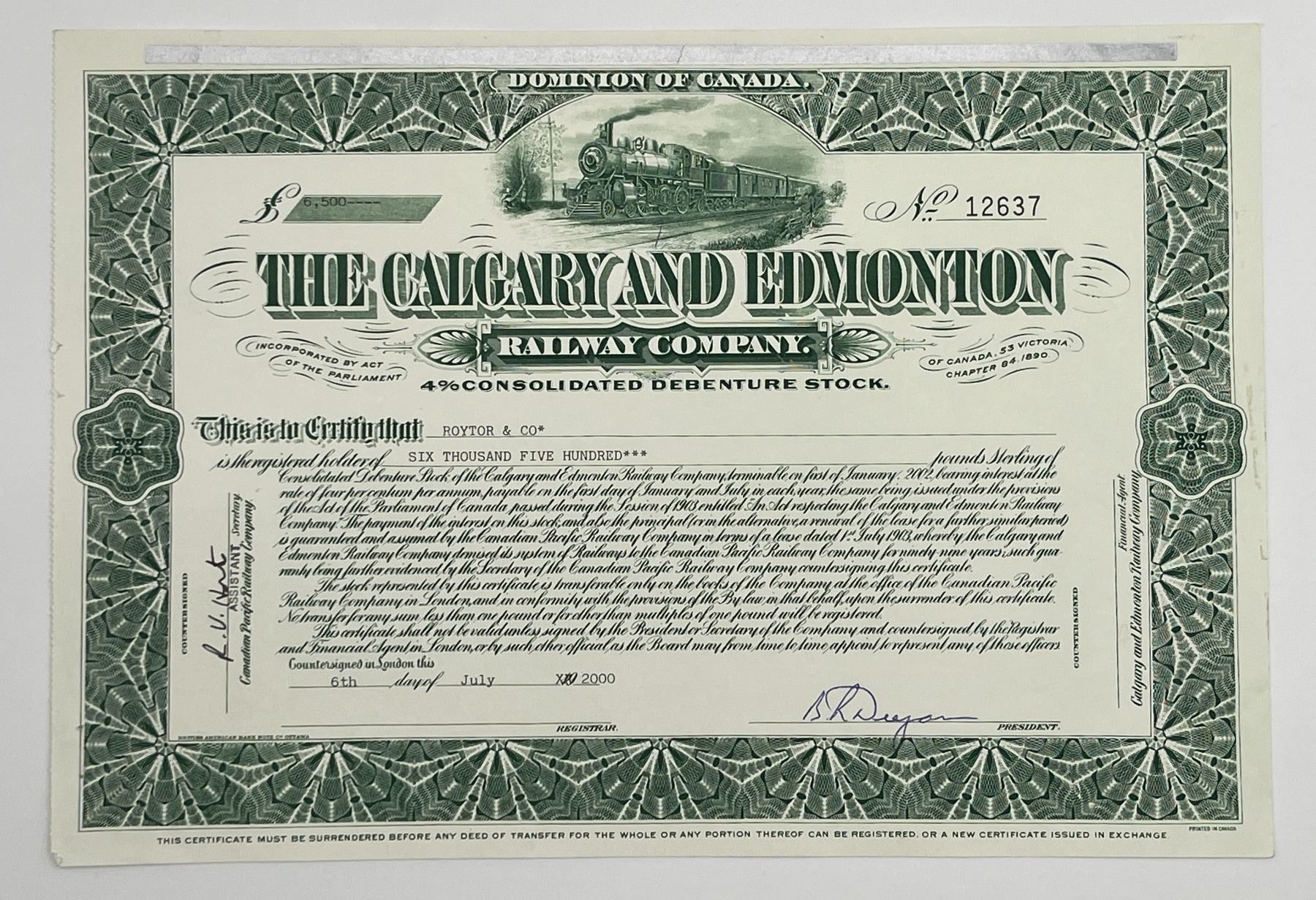 Vignette of Train. Started in 1890, this railway connected the city of Calgary to Edmonton. The purpose of the railway was to bring immigrants from eastern Canada to settle in western Canada. The railway and its branches had around 190 miles of track. Ultimately was leased by the Canadian Pacific Railway and became a subsidiary of the company. Very little is known about this railway and certificates from this railway are extremely rare. A must for any railway collector.