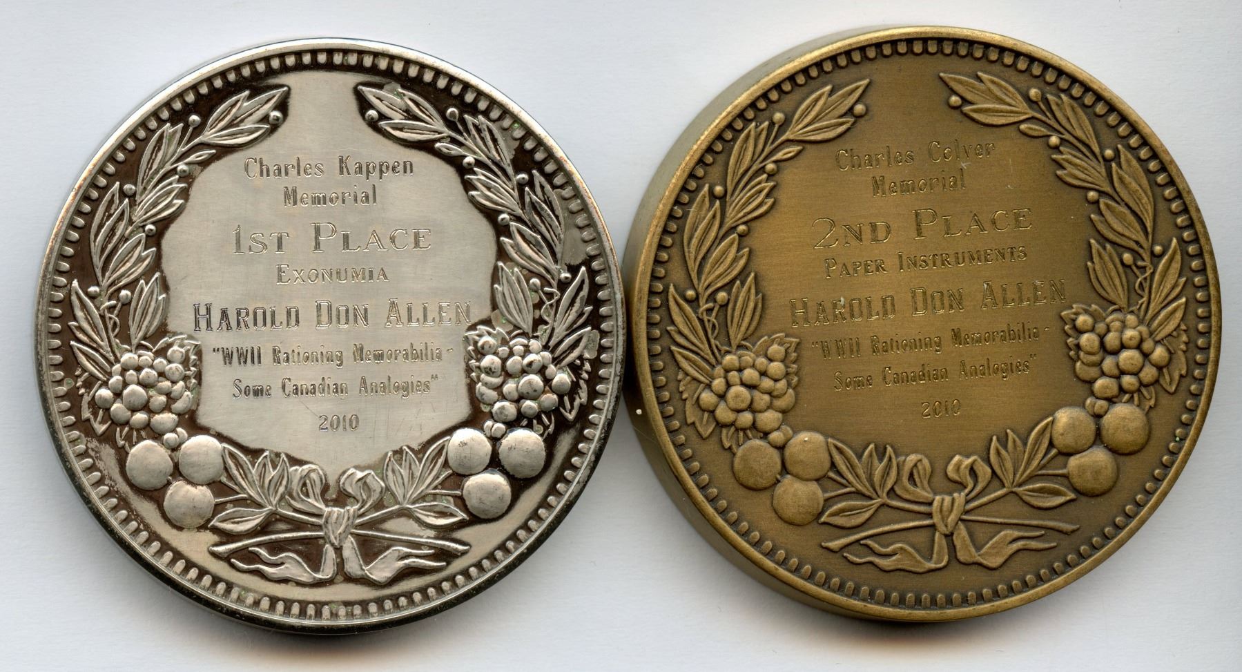 First and Second place medals awarded to Canadian Harold Don Allen in 2010. 2 pcs. (XRF)