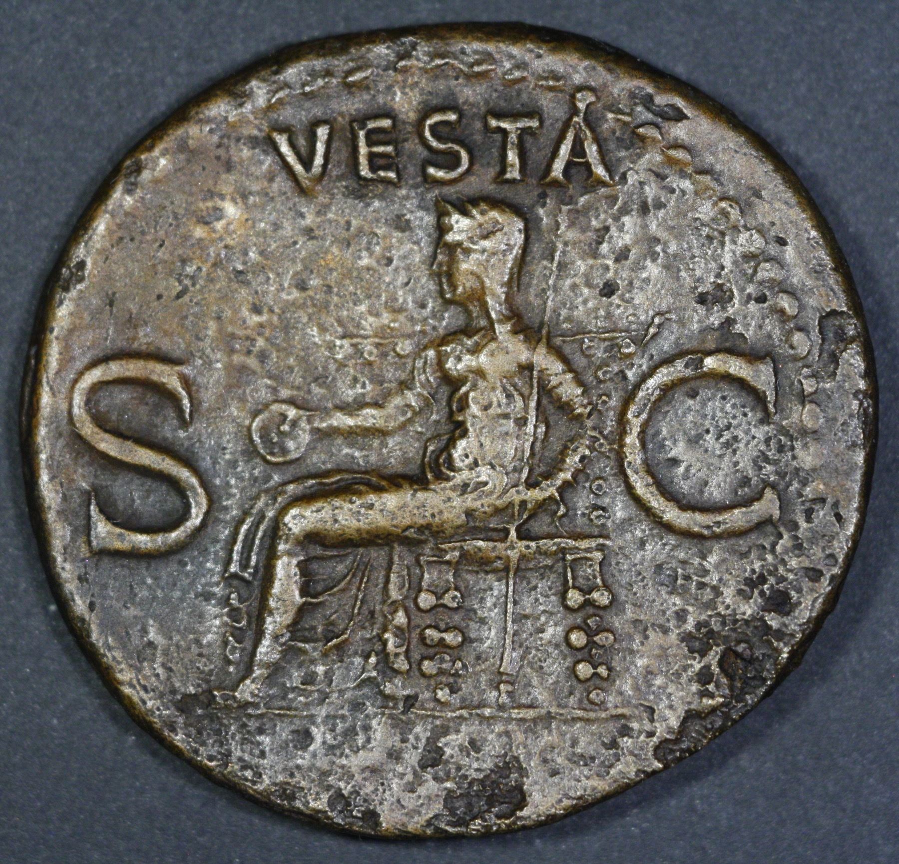 (29mm, 10.11g) Bare head right. Rev: Vesta seated left, holding patera and sceptre, VESTA above and S C to the sides. RIC 38 . VF/gVF.