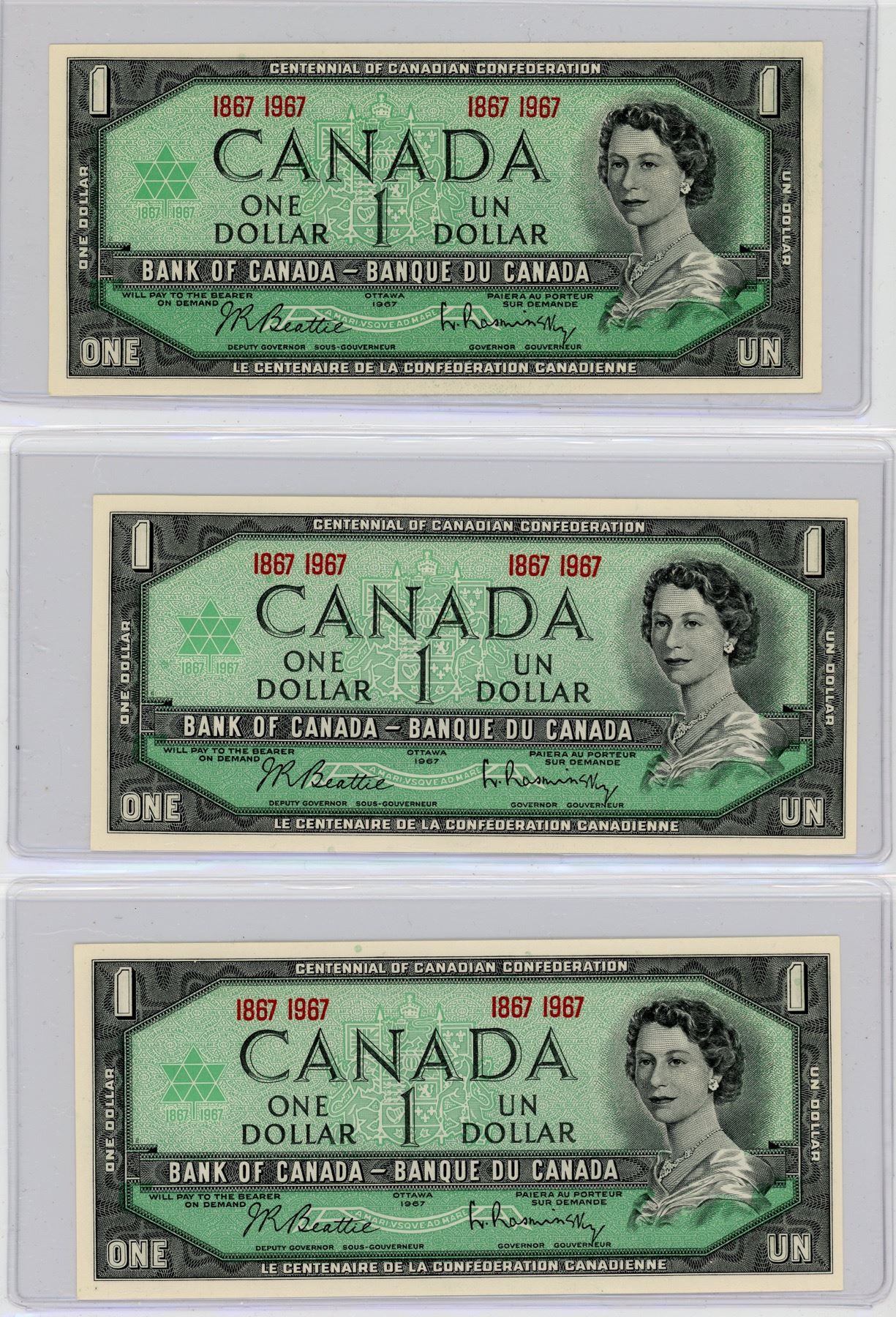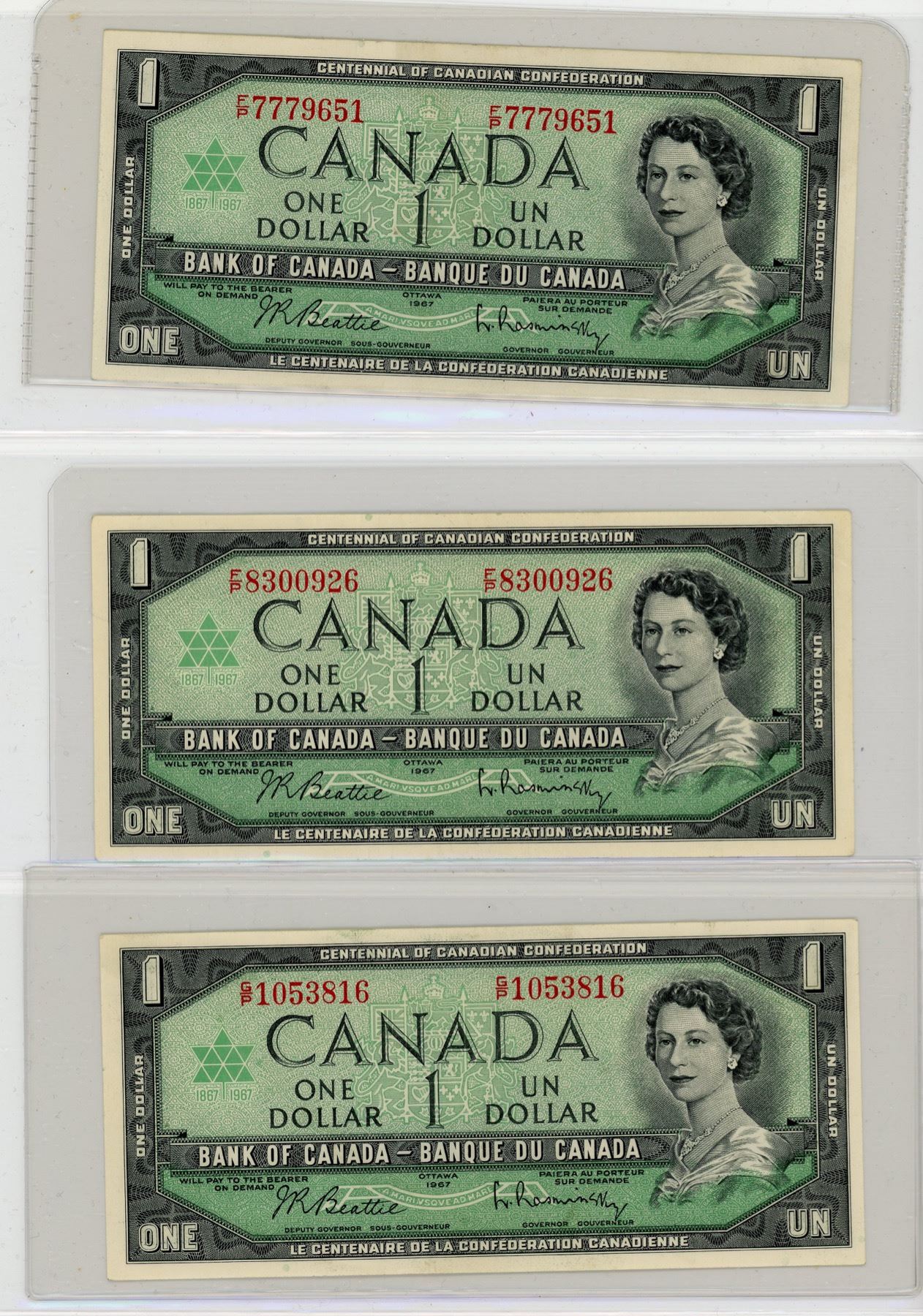 Over 100 notes in the $1 Bank of Canada collection. Featuring the famous 1954 Devils Face, 1954 Modified, 1967 and the 1973 series. Also included as replacement notes. Many of the notes are in uncirculated condition, and also several consecutive numbered runs.