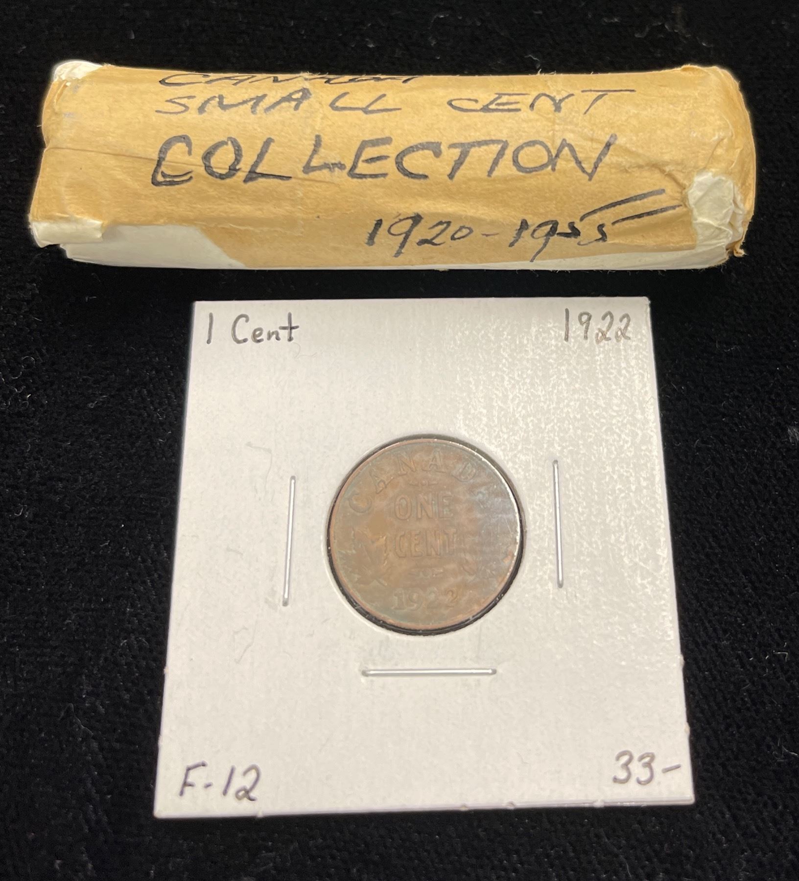 A sealed roll of Canada Small Cent Collection 1920-1955. Are you the one that will open this mystery roll? Included in the lot is a 1922 cent (key date) in fine condition.