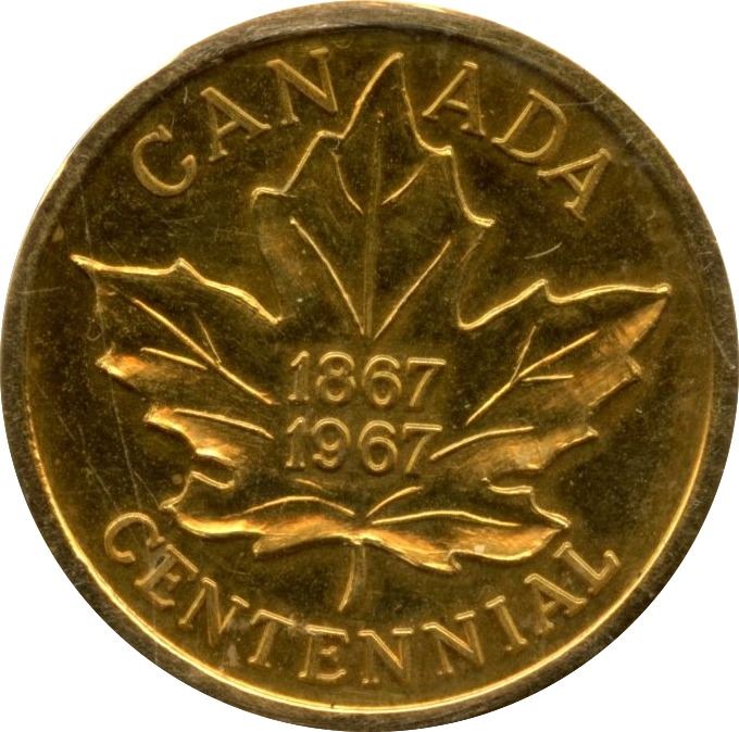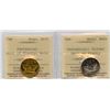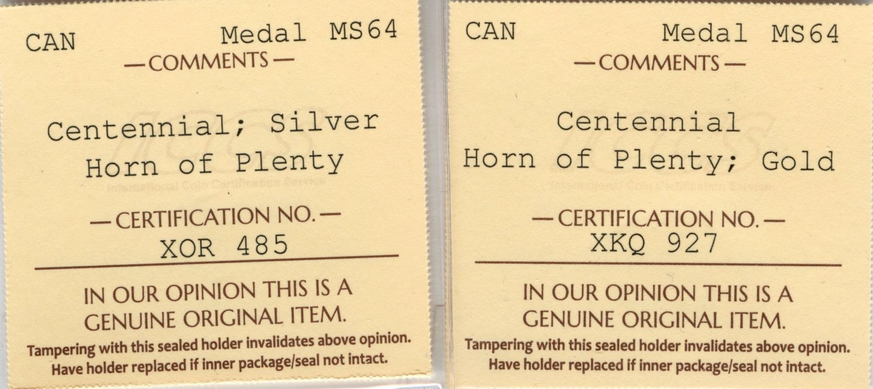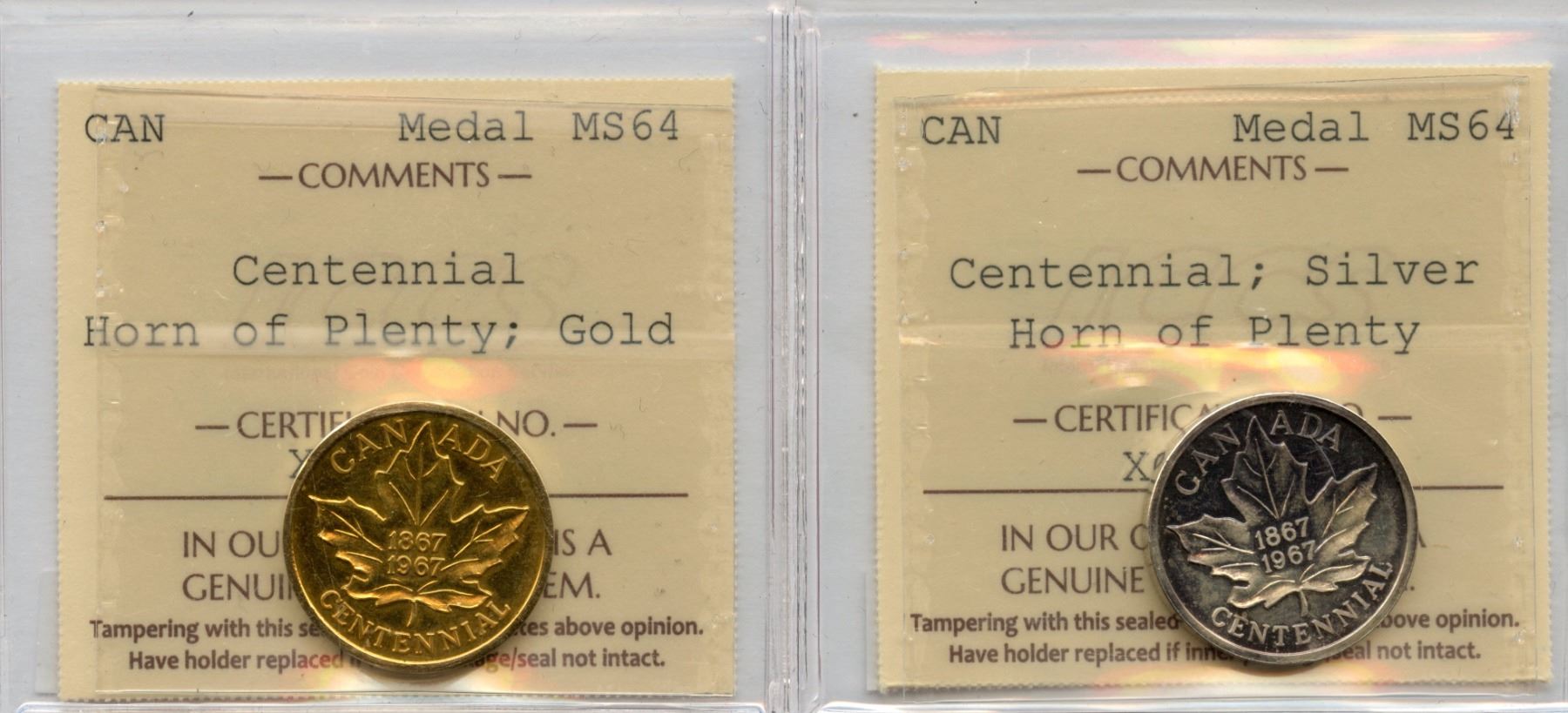 Lot of two ICCS MS-64 graded 21mm Canadian Centennial medallions, one in gold - 6.8g and one in silver - 4.8g. Cornucopia (horn of plenty) in agriculture with moon and sun on one side, and a large maple leaf on other with 1867 and 1967 dates. Both very scarce and impossible to find. Origin and mintage unknown, but presumably from Western Canada.