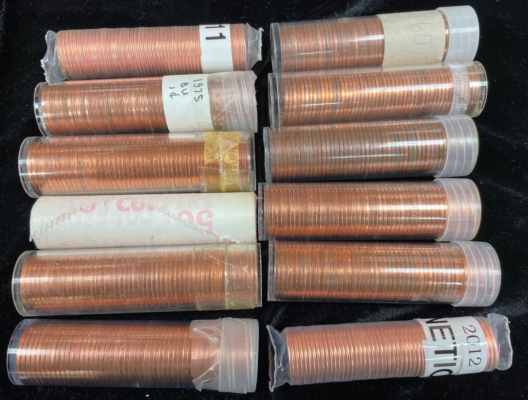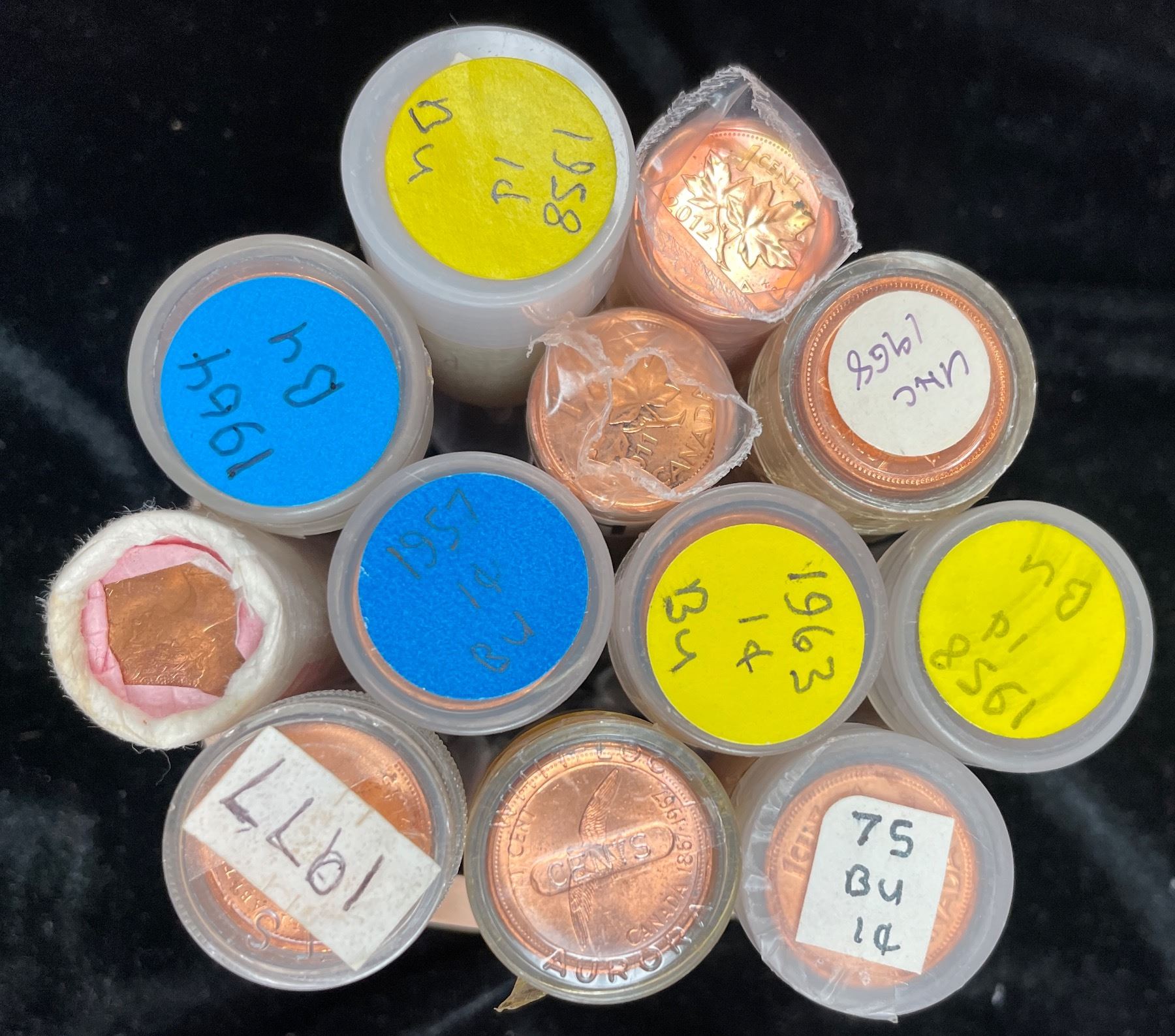 1 original bank roll: early 1980's; 2 mint rolls: 2011, 2012 (magnetic); 9 tubes - some coins with toning, typically on edge: 1957 (49 coins), 1958 (47 coins), 1958 (48 coins), 1963 (48 coins), 1964 (48 coins, sealed), 1967 (50 coins, sealed), 1968 (50 coins, sealed), 1975 (48 coins, sealed), 1977 (50 coins). Sold "As Is". 12 Pcs.