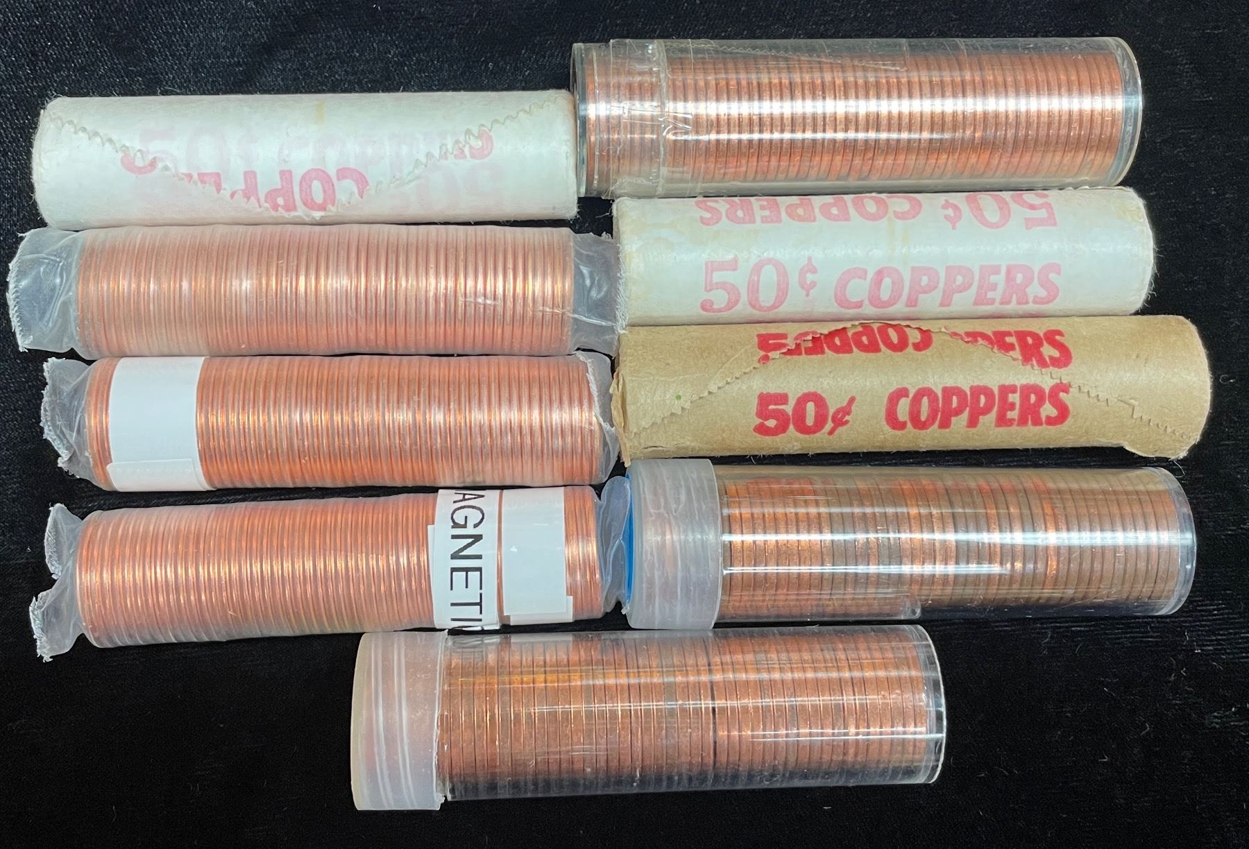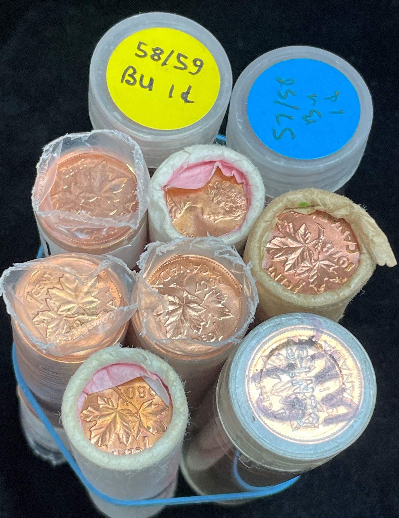 3 original bank rolls: 1978, 1980, early 1980's; 3 mint rolls: 2007, 2011, 2012 (magnetic); 3 tubes - some coins with toning, typically on the edge: mix of 1957/1958 (48 coins), mix of 1958/1959 (47 coins), 1961 (50 coins, sealed). Sold "As Is". 9 Pcs.