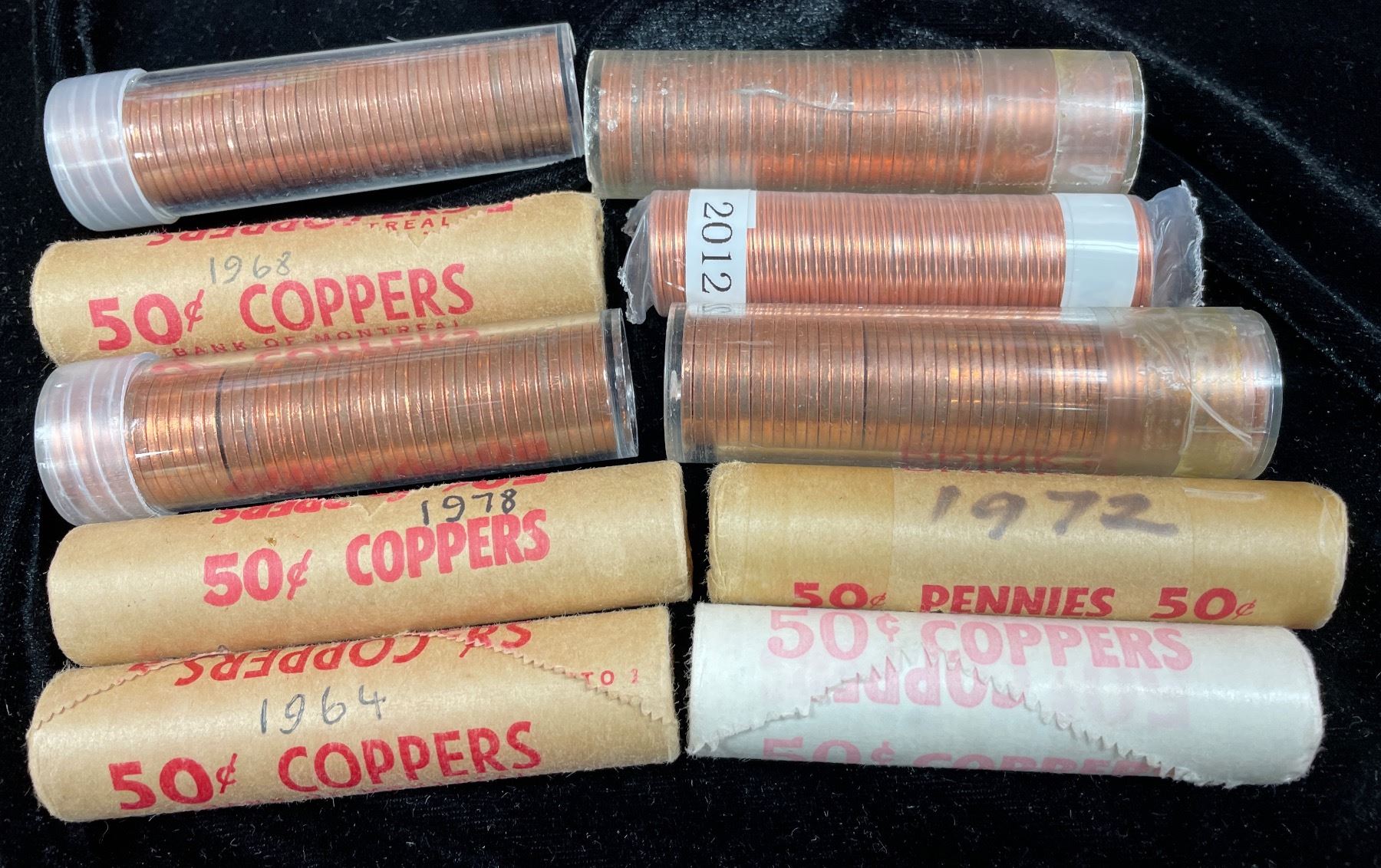 5 original bank rolls: 1964, 1968, 1970, 1972, early 1980's; 1 mint roll: 2012 (magnetic); 4 tubes - some coins with toning, tyically on the edge: 1958 (47 coins), 1964 (49 coins), 1964 (50 coins, sealed), 1965 (50 coins, sealed). Sold "As Is". 10 Pcs.