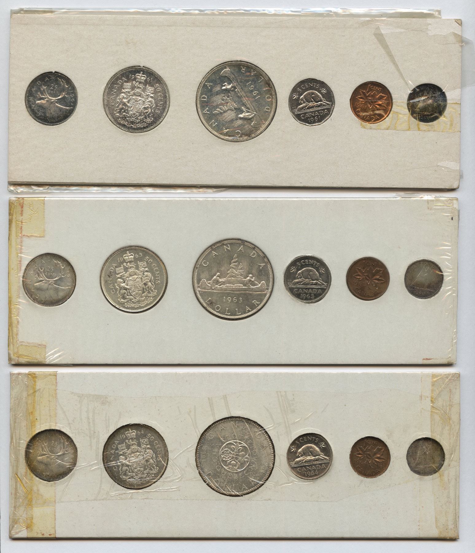 Lot of Canadian Royal Canadian Mint sets 1961, 1963 & 1964 in cardboard and cello holders.