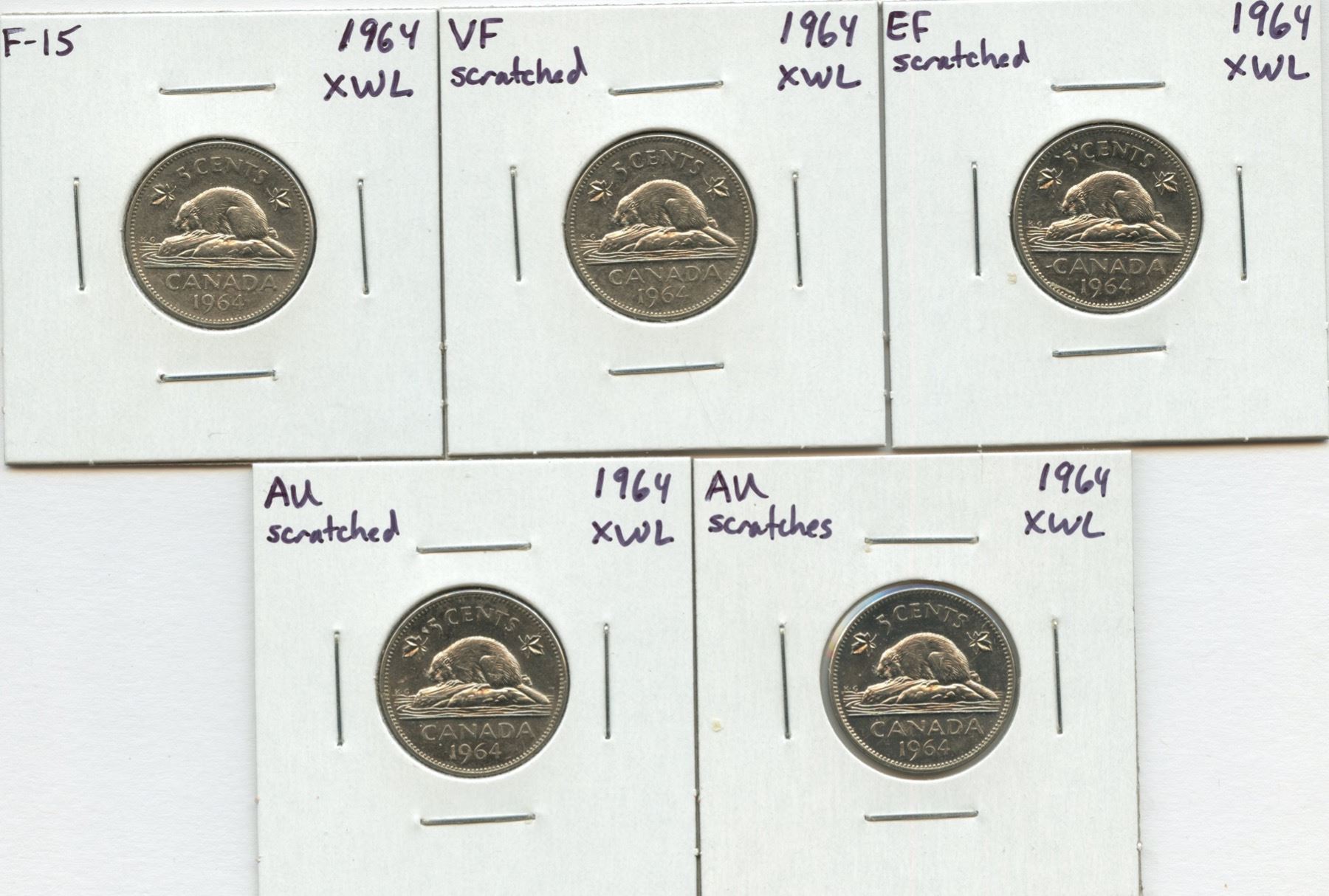 Dealer lot of five 5 cents 1964 XWL (extra water line). Key Date culls. F to AU grades. (5)