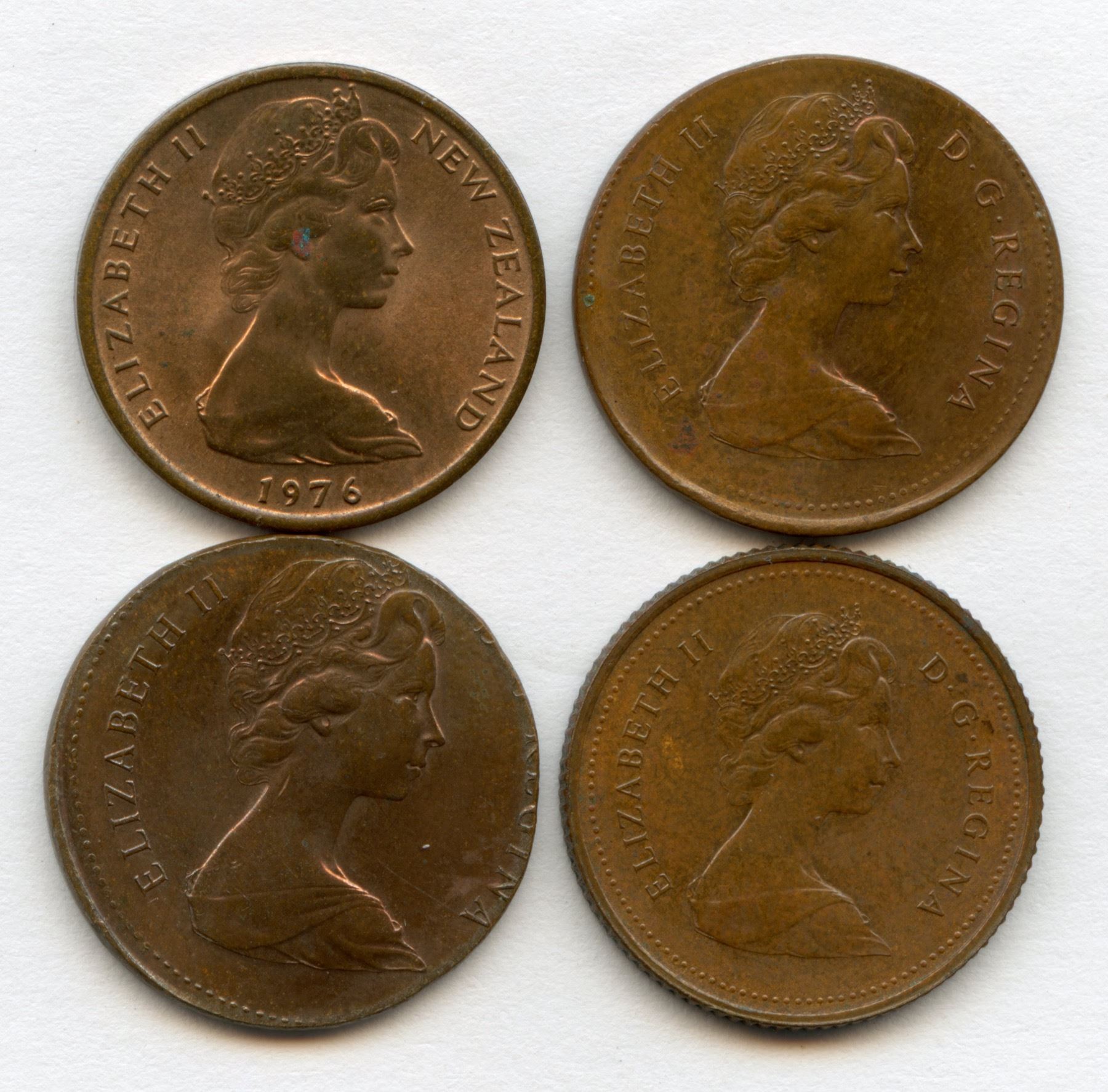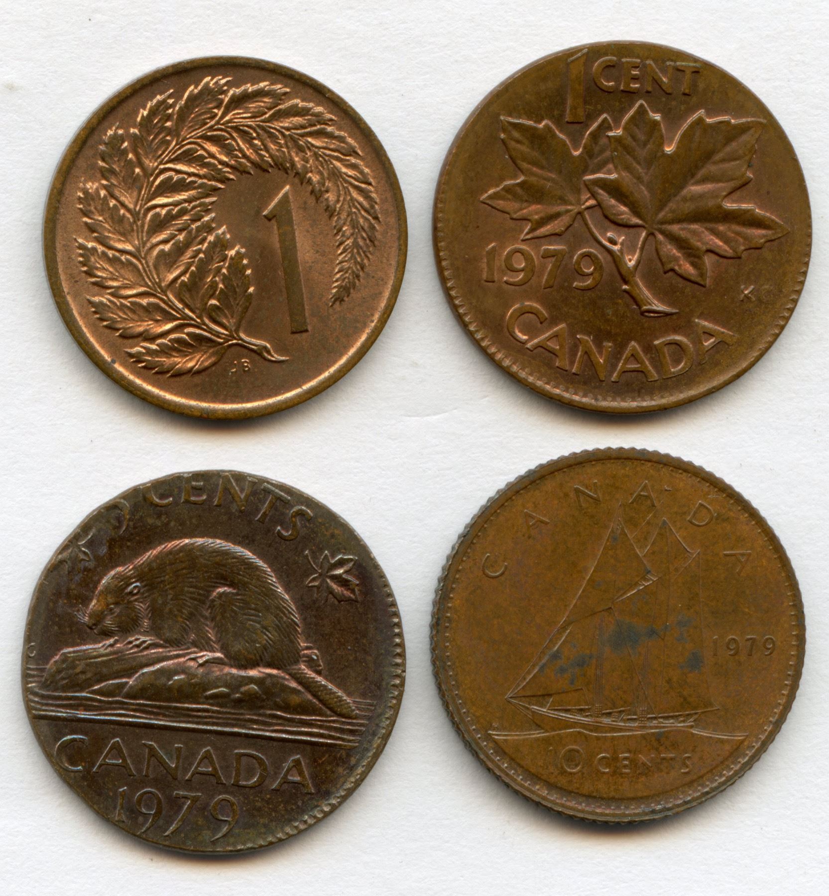 1979 1-cent, 5-cent and 10-cent struck on a New Zealand bronze 1-cent planchets. While finding Canadian 1c struck on New Zealand 1c planchets are somewhat uncommon, a set like this is probably unique. These examples are uncirculated and range from brown to red-brown with some remaining lustre. This 3-coin lot includes an older (1976) New Zealand 1-cent (KM #31.1), as a reference. Patrick Glassford Collection.