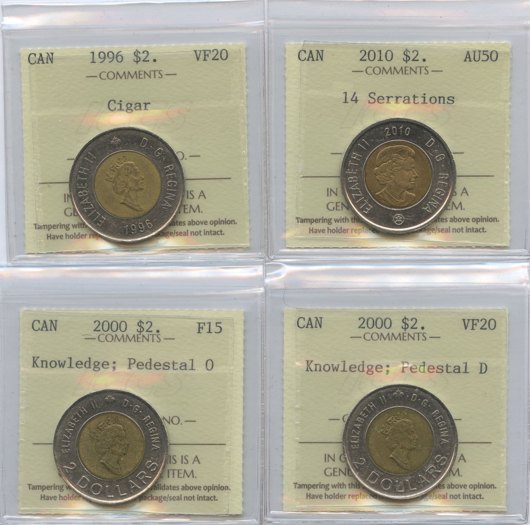 1996 "Cigar", VF20: 2000 "Knowledge; Pedestal 0", F15: 2000 "Knowledge; Pedestal D", VF20: 2010 "14 Serrations", AU50. All coins ICCS certified. 4 Pcs.