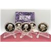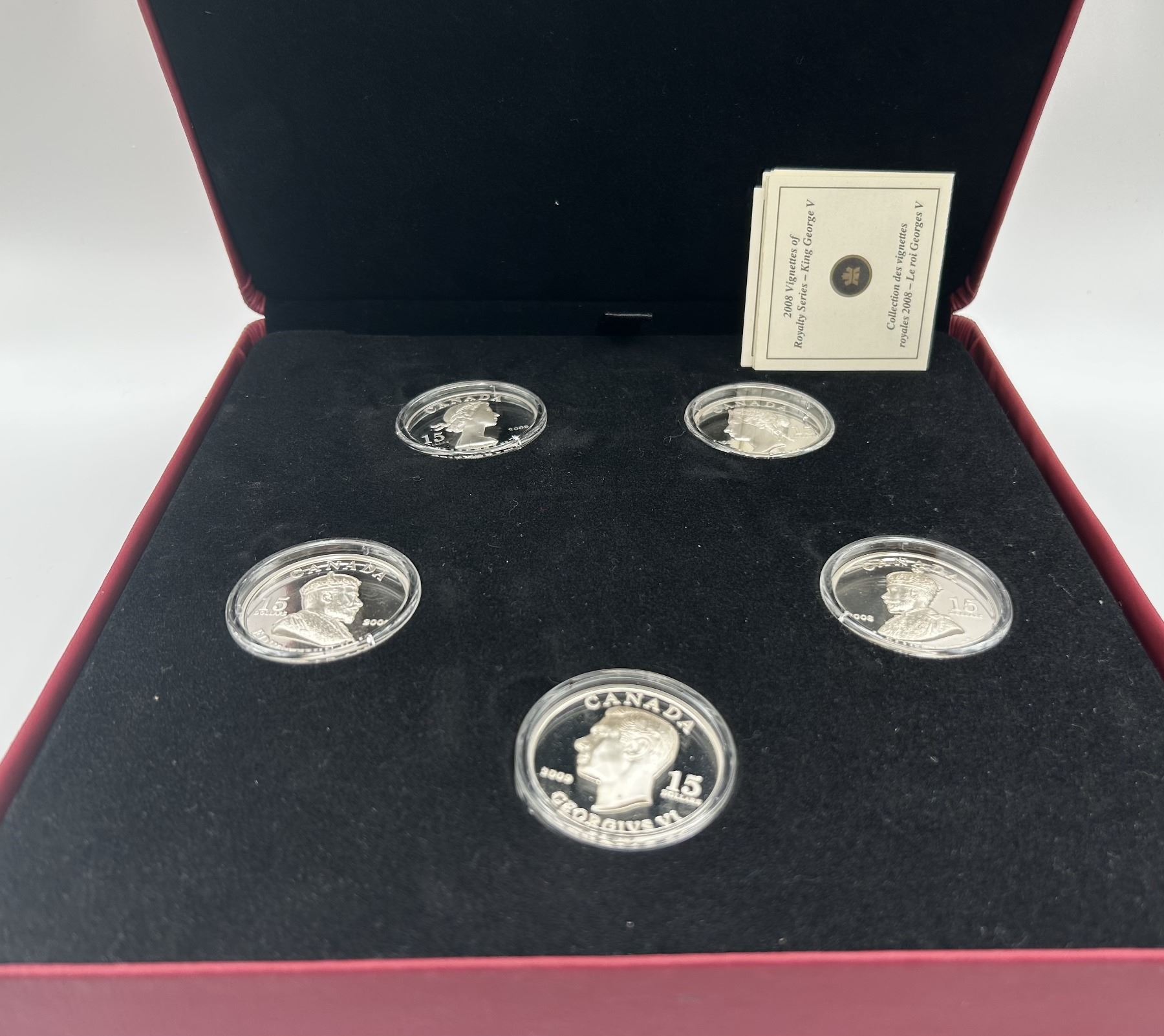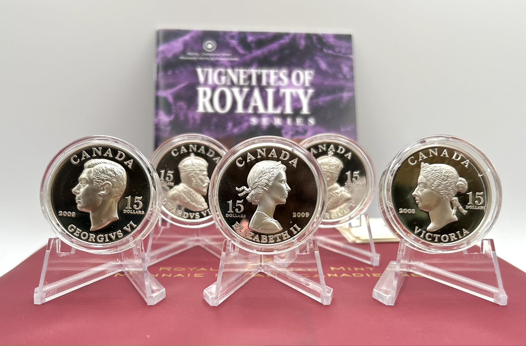 150g Sterling Silver Coins. The Vignettes of Royalty Collection, Mintage 10,000. Item #106812. "these five magnificent sterling silver coins showcase the effigies of the five monarchs that have appeared on Canada’s circulation coins. With the current effigy of Her Majesty Queen Elizabeth II on the obverse, they are our first double-effigy coins ever!" Coins are in box with COA's.