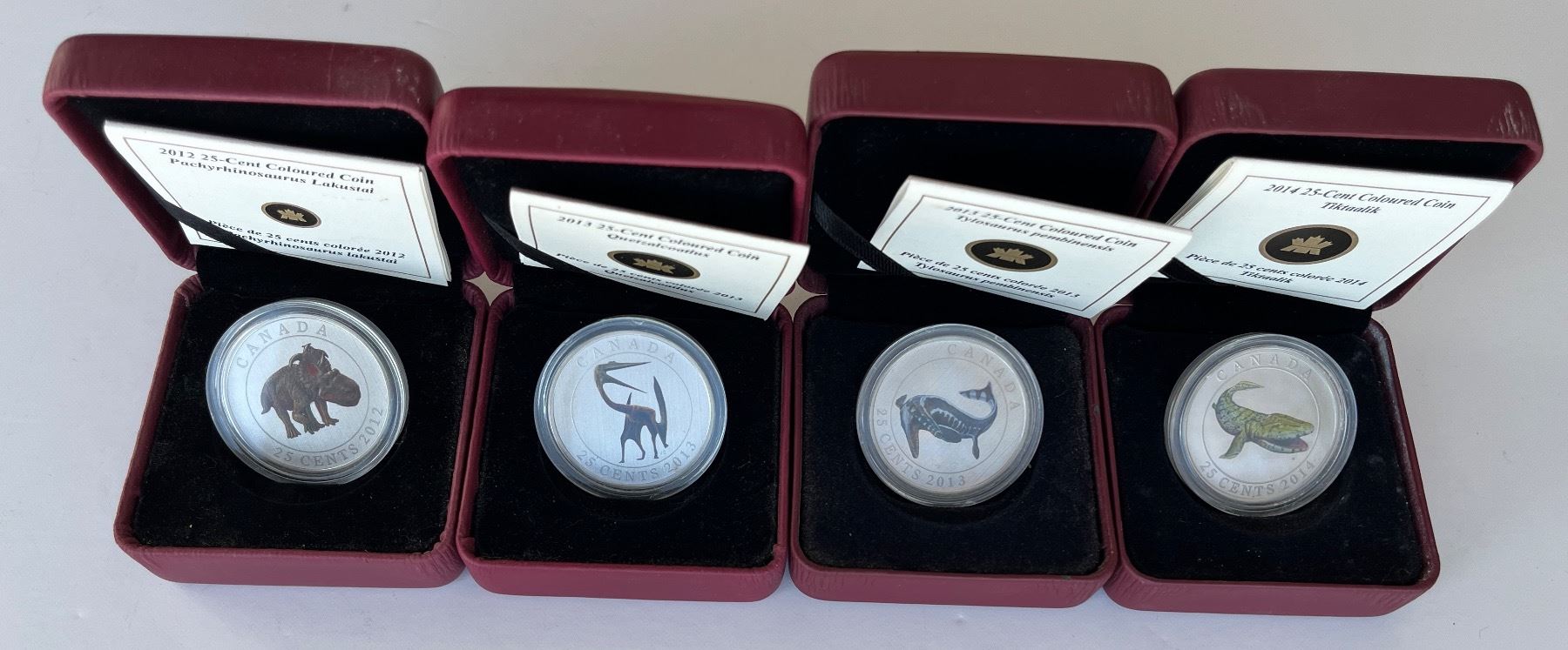 Coins included Canada 25-cent Prehistoric Animals - 2012 Pachyrhinosaurus Lakustai, 2013 Quetzalcoatlus Dinosaur, 2013 Tylosaurus Pembinensis, 2014 Tiktaalik. Glow In The Dark Cupronickel Coins. (4)
