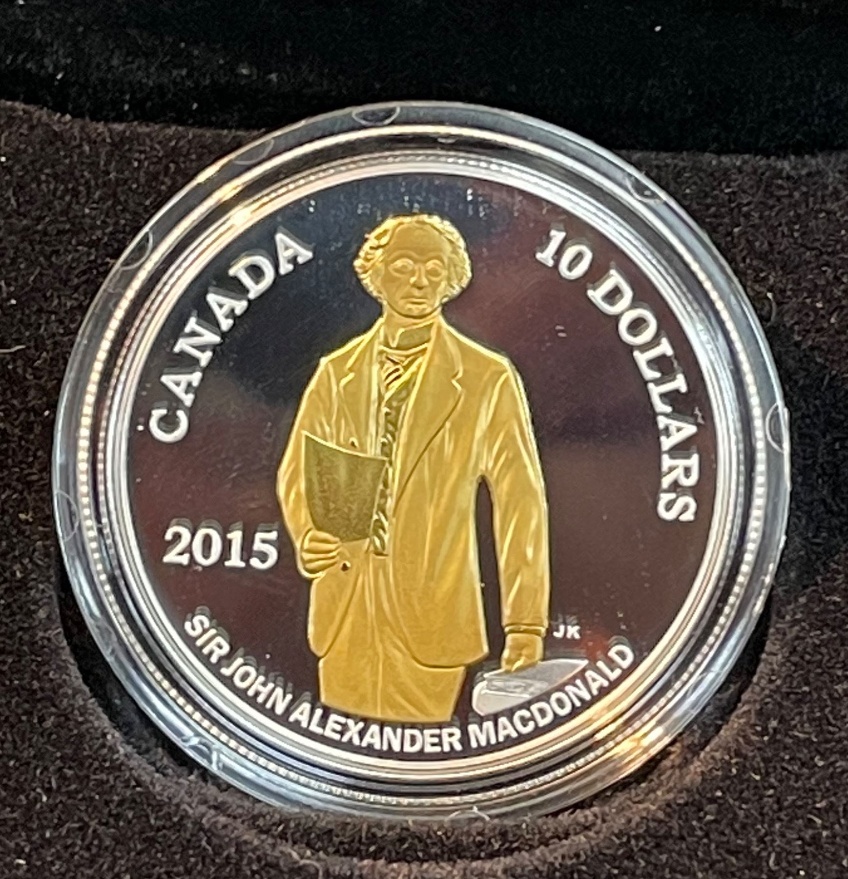 This proof-quality coin celebrates the 200th anniversary of the birth of Canada's first Prime Minister and key nation-builder, Sir John A. Macdonald. Fine Silver & Gold Plated Coin - Fine Silver - Mintage: 10,000 - With Box, sleeve, and COA - RCM 130630