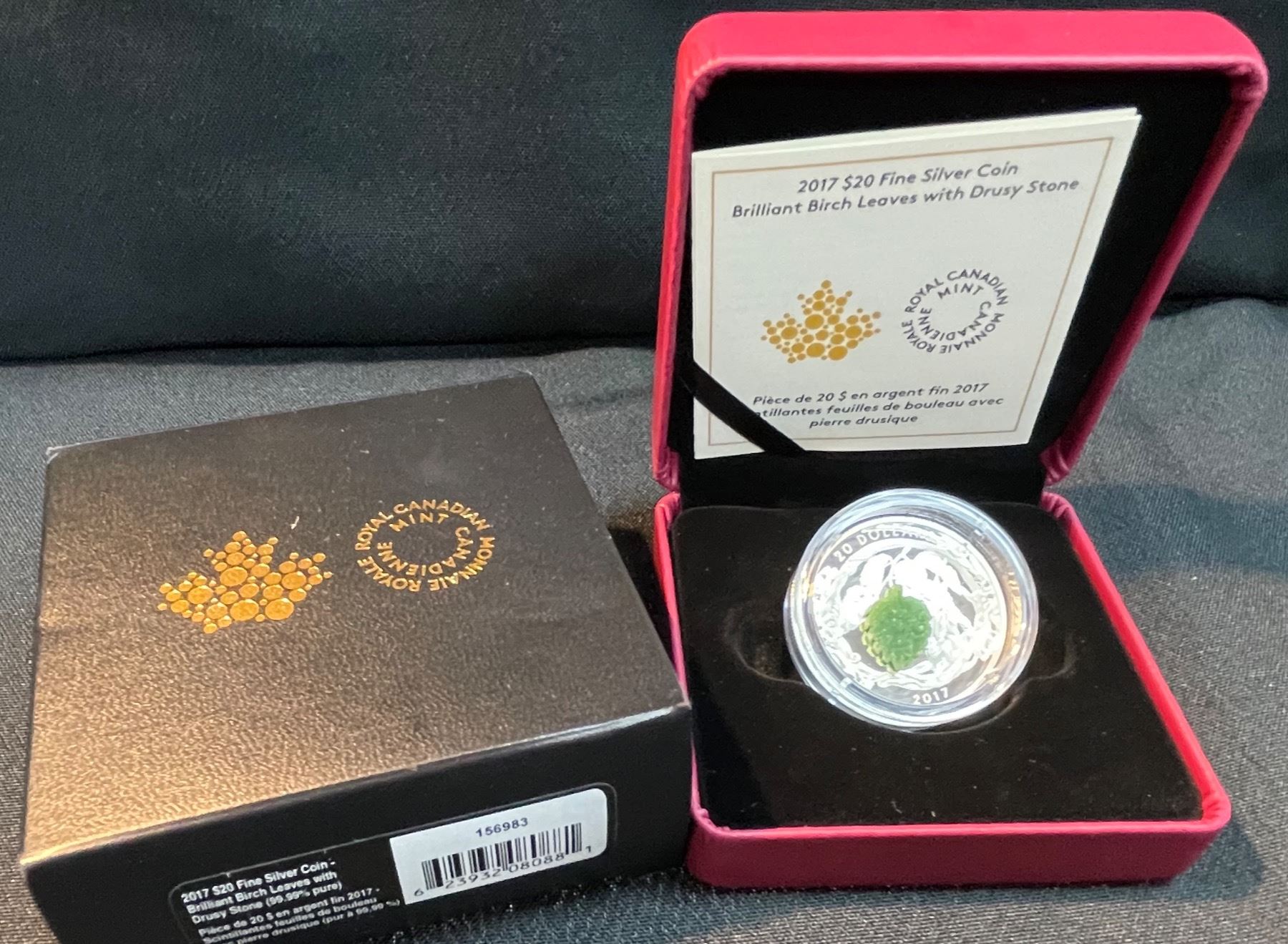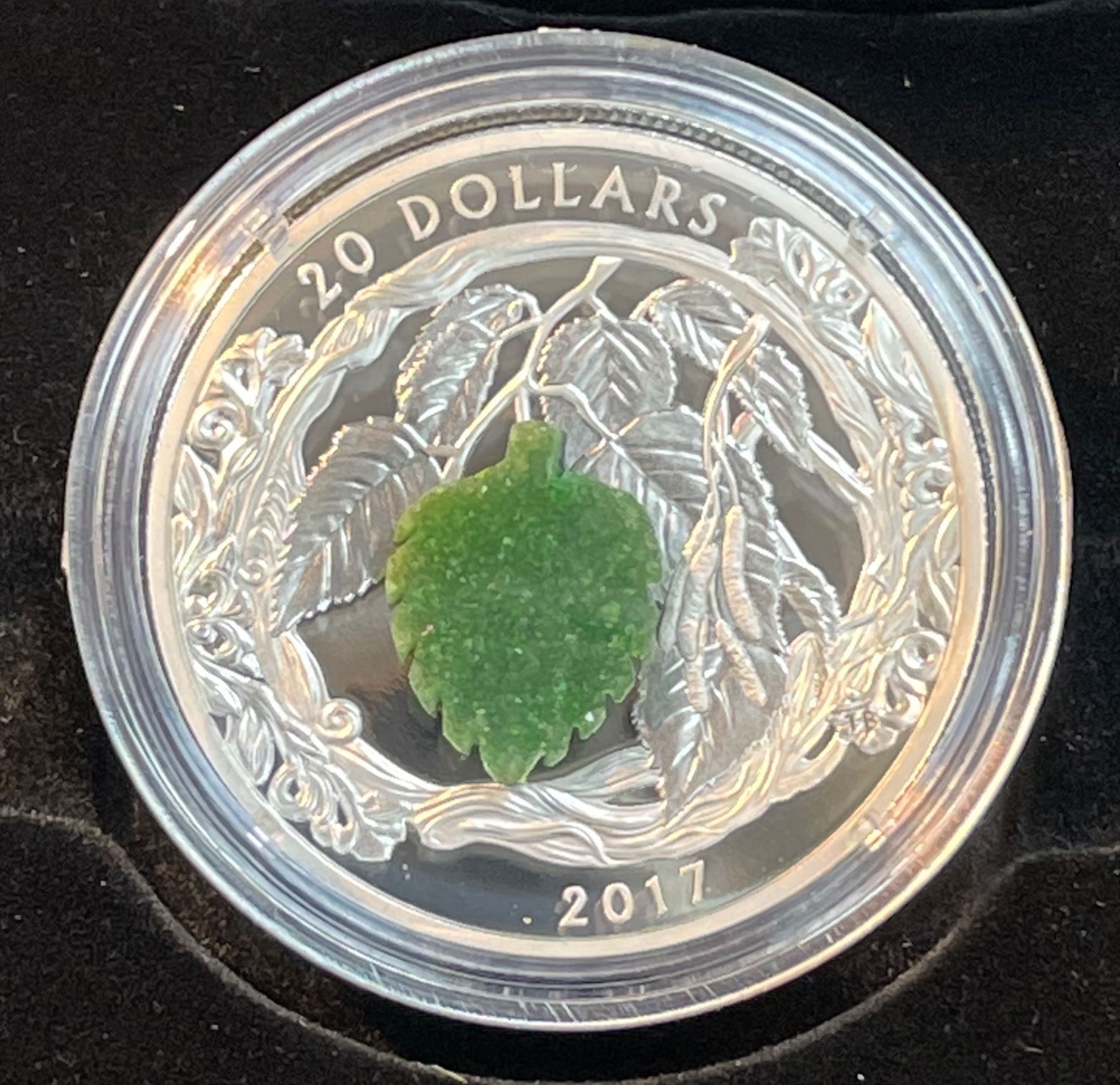 Featuring a leaf-green crystal-encrusted drusy stone along with rich textural engraving. Fine Silver - Mintage: 5,500 - With Box, sleeve, and COA - RCM 156983