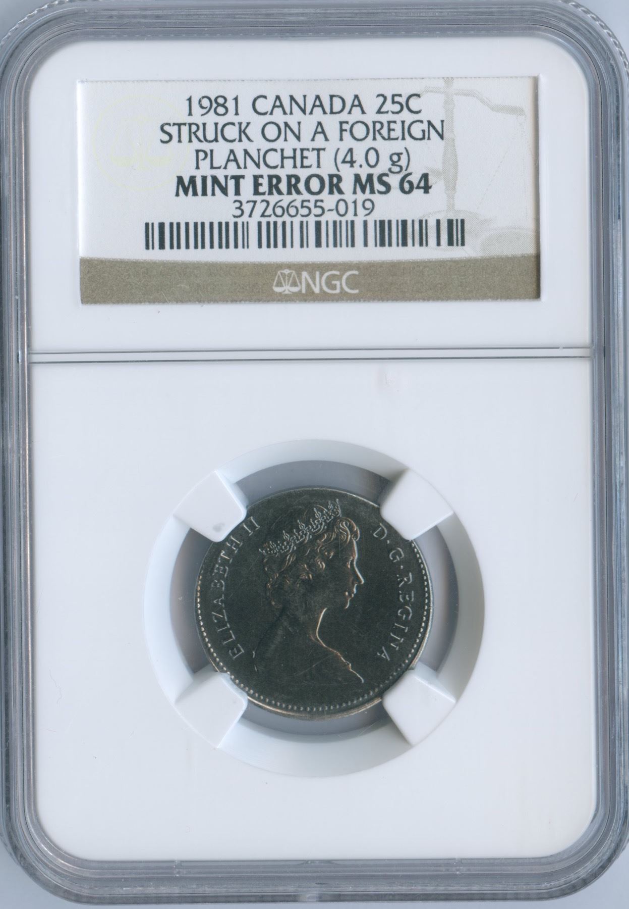 1981 25-cent struck on a 4.0 gms non-magnetic foreign planchet. Given the weight and high lustre of the suspected composition (stainless steel), this coin was struck on a Bangladesh 50 Poisha planchet. A beautiful coin and graded MS-64 by NGC.