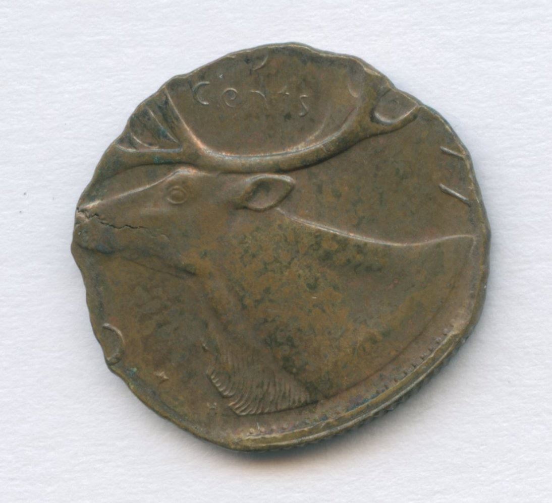 1977 25-cent struck on a 1.49 gram cartridge brass planchet intended for a El Salvador 1 Centavo. The planchet had also cracked under the striking pressure. Lovely mint state error, toned, likely very scarce, if not unique.