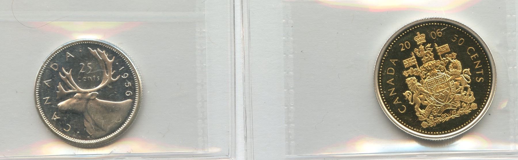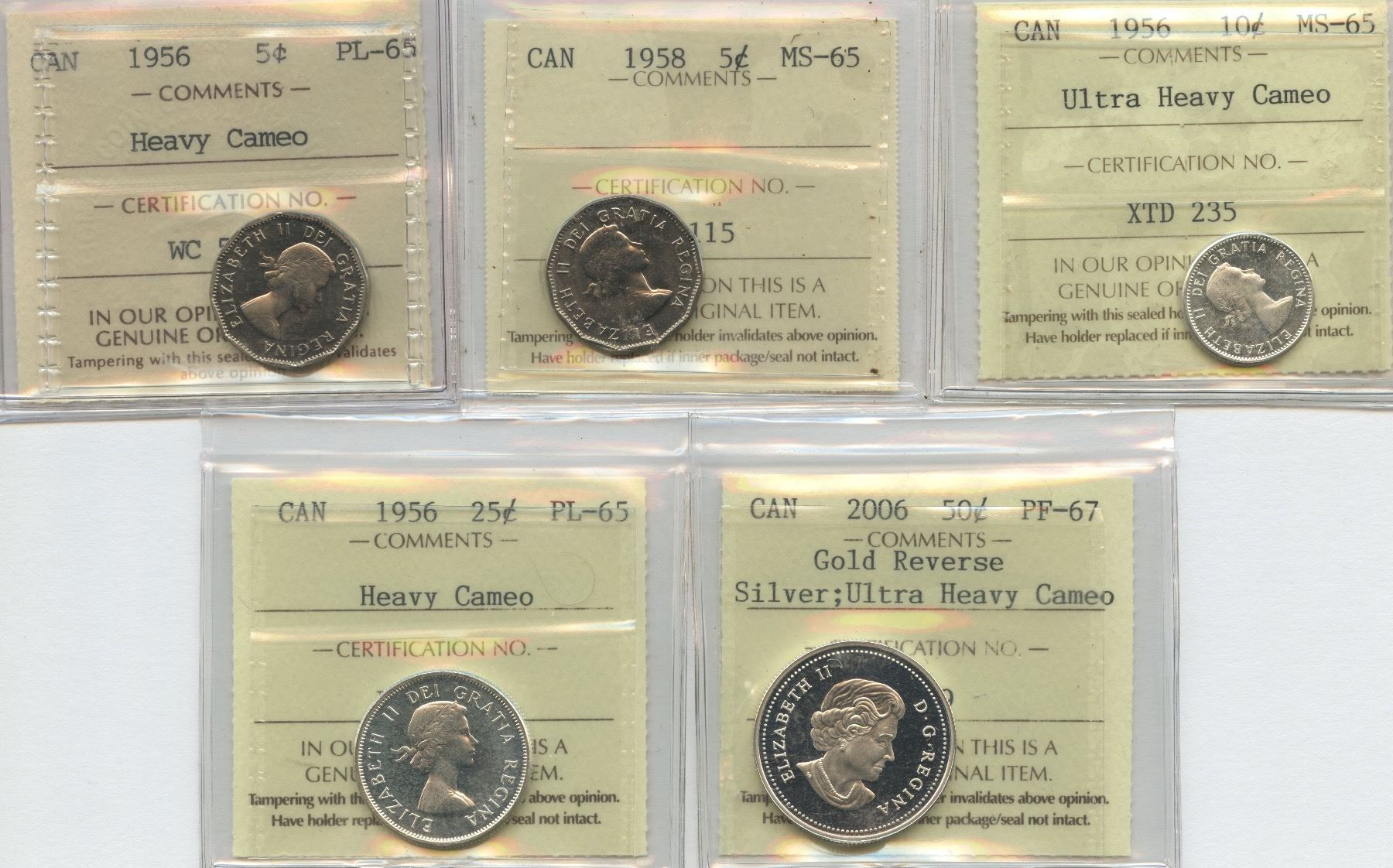Includes: 1956 Five Cents PL-65, Heavy Cameo. 1958 Five Cents MS-65. 1956 Ten Cents MS-65, Ultra Heavy Cameo. 1956 Twenty-Five Cents PL-65, Heavy Cameo. 2006 Fifty Cents PF-67, Gold Reverse, Ultra Heavy Cameo. 5 pcs.
