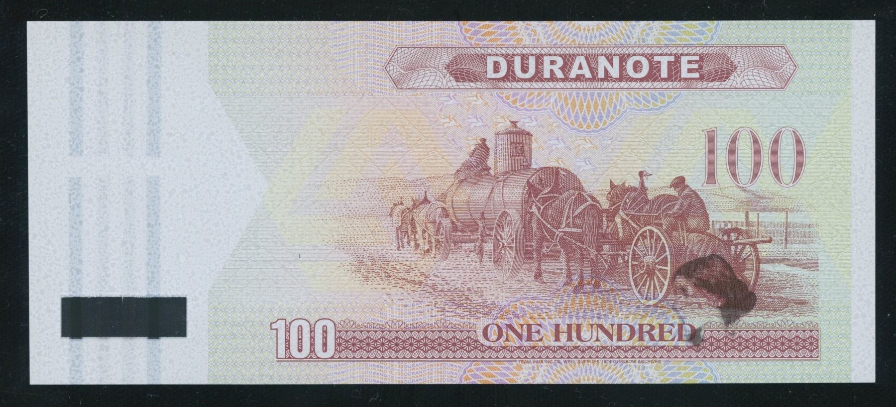 Was a product of Mobil Chemical and AGRA Vadeko of Canada. Trials of DuraNote were not successful and the project was abandoned. Patents for DuraNote were sold following the Exxon-Mobil merger. Several DuraNote advertising notes were produced by Silba International, Banknote Design & Security Printing, Inc. Today these sometimes appear on the collectors’ market. DuraNote offered advanced counterfeit protection through being constructed of 21 ultra-thin layers of OPP film, adhesive, coatings and printable surfaces. Contemporary promotional material claimed it lasted four times longer than conventional rag paper-printed notes. It stayed crisp and did not dirty easily. These properties translated into reduced printing costs. In addition, the manufacturers proposed that each note would have a clear plastic window which, along with a choice of embedded security features, would make notes difficult to copy. DuraNote was an innovative synthetic bank note with the capability of embedding anti-counterfeiting devices between its substrates Test notes were printed for 21 countries using the regular bank note printing plates for each of the countries concerned. Among them was the United States, which produced some 40,000 sheets of DuraNote currency. These have never escaped the Bureau of Engraving and Printing. Presumably they have been destroyed or are buried deep in the bureau’s archive. Since 1999 DuraNote is concentrating on improved laminated substrates, just as the Canadian Domtar is researching with financing from the Canadian Government. We thank our friend Stane Strauss for this information.
