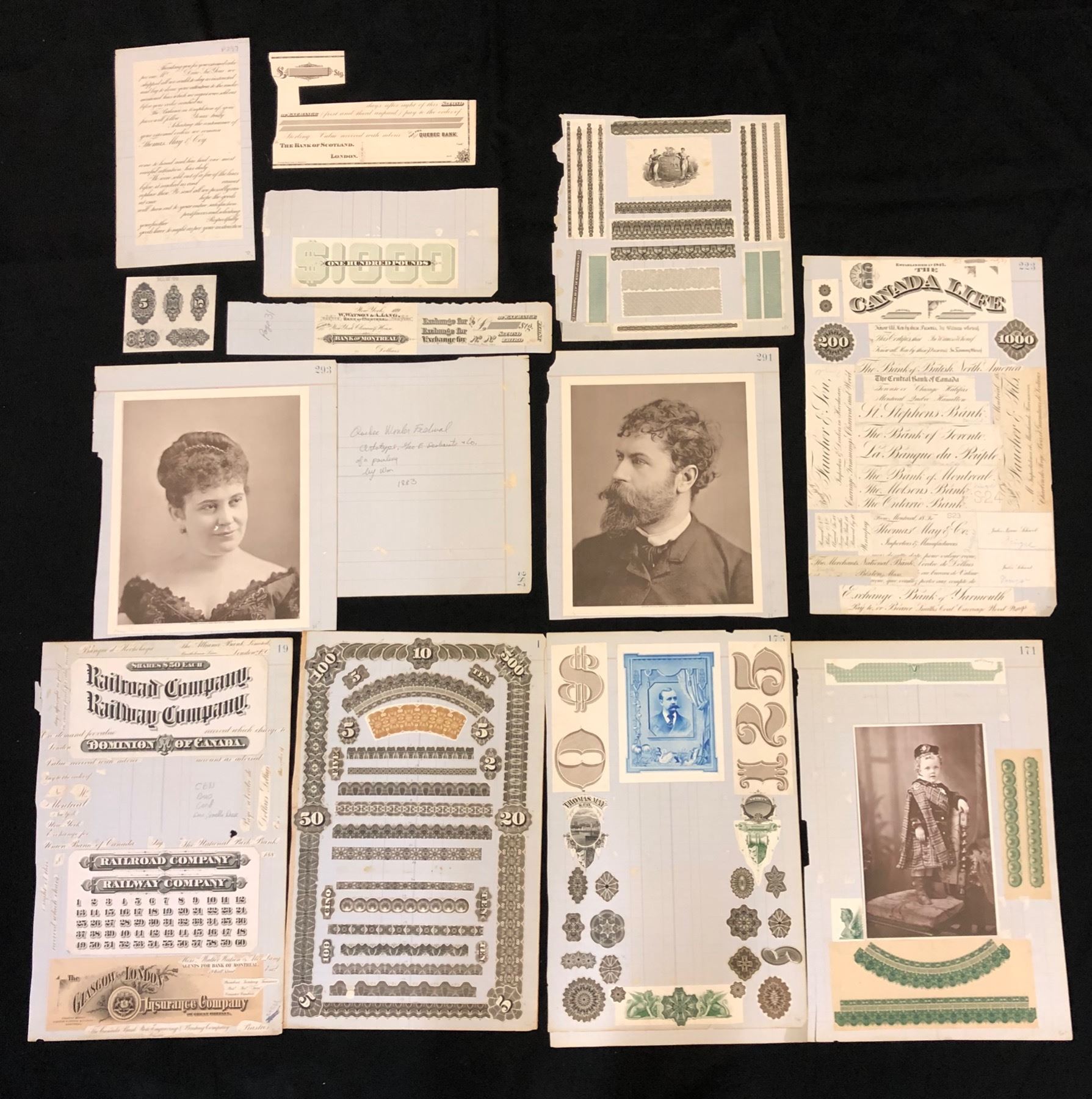 Canada Bank Note Co., large collection of bits of text, a few Artotype portraits, Bank or other company names, counters, guilloches etc. mounted on ledger paper