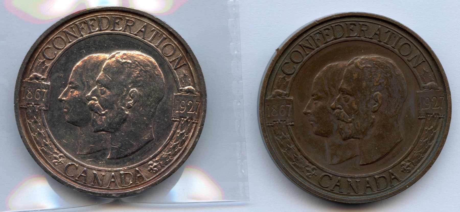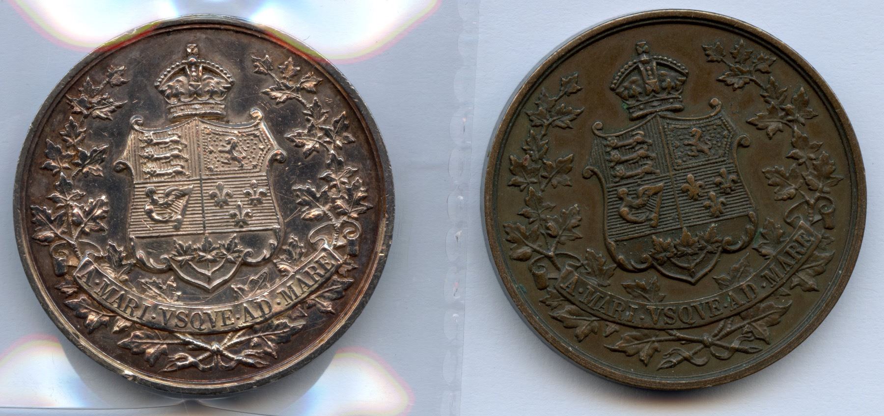60th Anniversary of Confederation Competition Medals. Each is 35mm with plain edges and unsigned. These medals were “distributed to the winner of local competitions in schools for essays on some subject of Canadian history.” Reportedly, 1,840 pieces were struck in bronze, 600 in silver, of which 540 were distributed. In Expo Fall 2023 sale, silver example sold for $850 before fees. 2 Pcs.