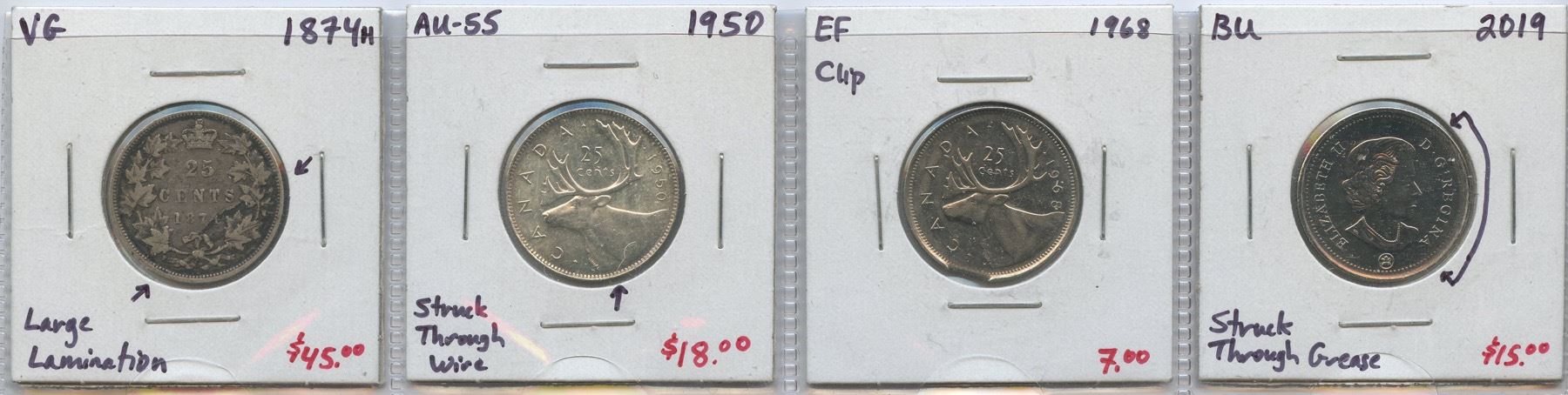 1874H, VG - Large lamination on reverse (1/3 of surface); 1950, AU-55 - Struck through wire on reverse; 1968, EF - clip; 2019, BU - Struck thru grease on along rim on obverse. Validated by R. Paulen. 4 Pcs.