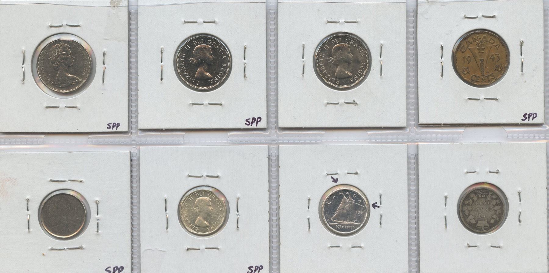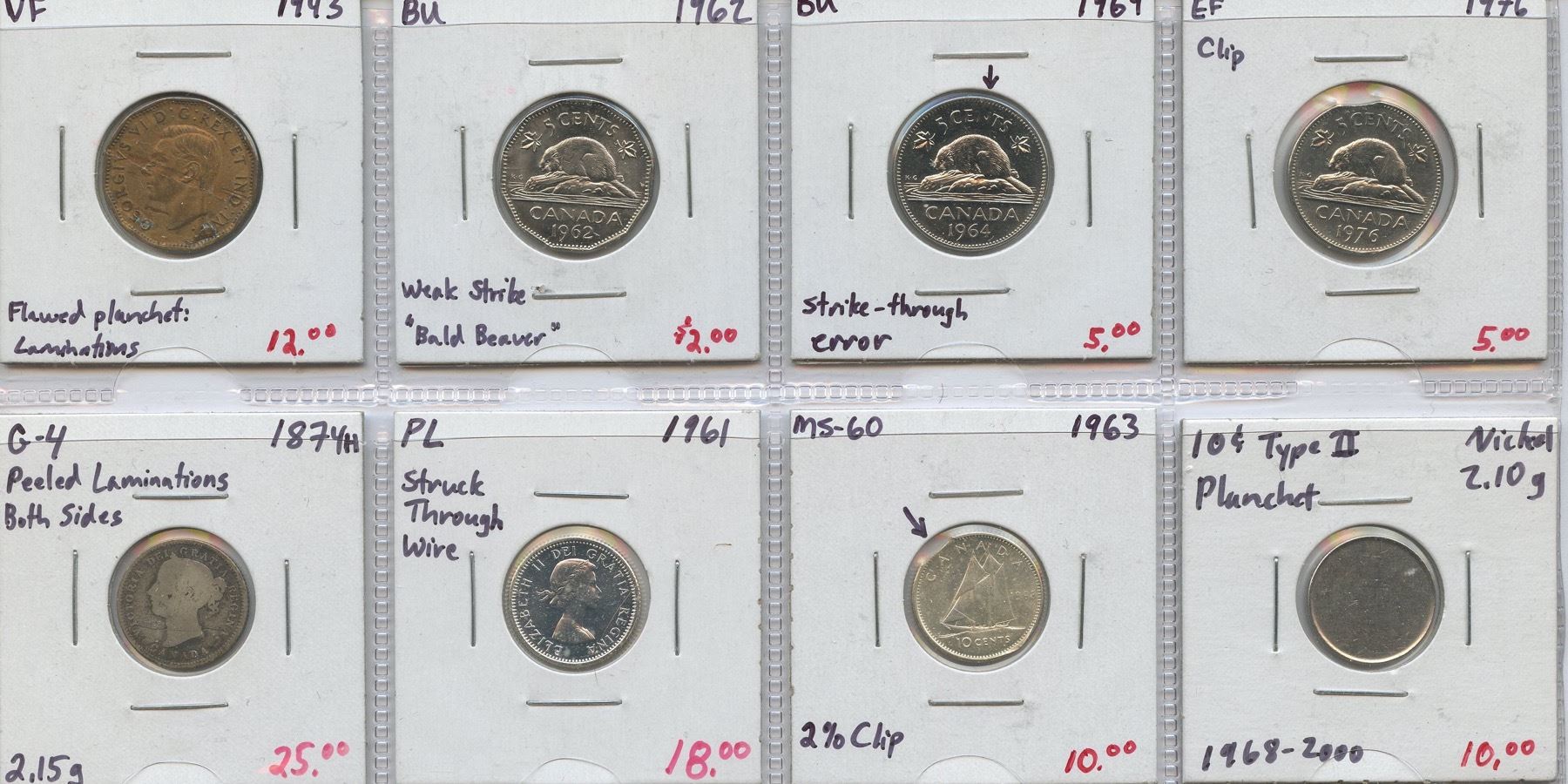 1943 5 Cents, VF - impressive laminations on obv; 1962 5 Cents, BU - weak strike "bald beaver"; 1964 5 Cents, BU - strike through; 1976 5 Cents EF - Clip; 1874H 10 Cents, G-4 - peeled laminations on obv & rev; 1961 10 Cents, PL - large struck through wire on reverse; 1963 10 Cents, MS-60 - 2% clip; 10 Cents Type II planchet. Validated by R. Paulen. 8 Pcs.