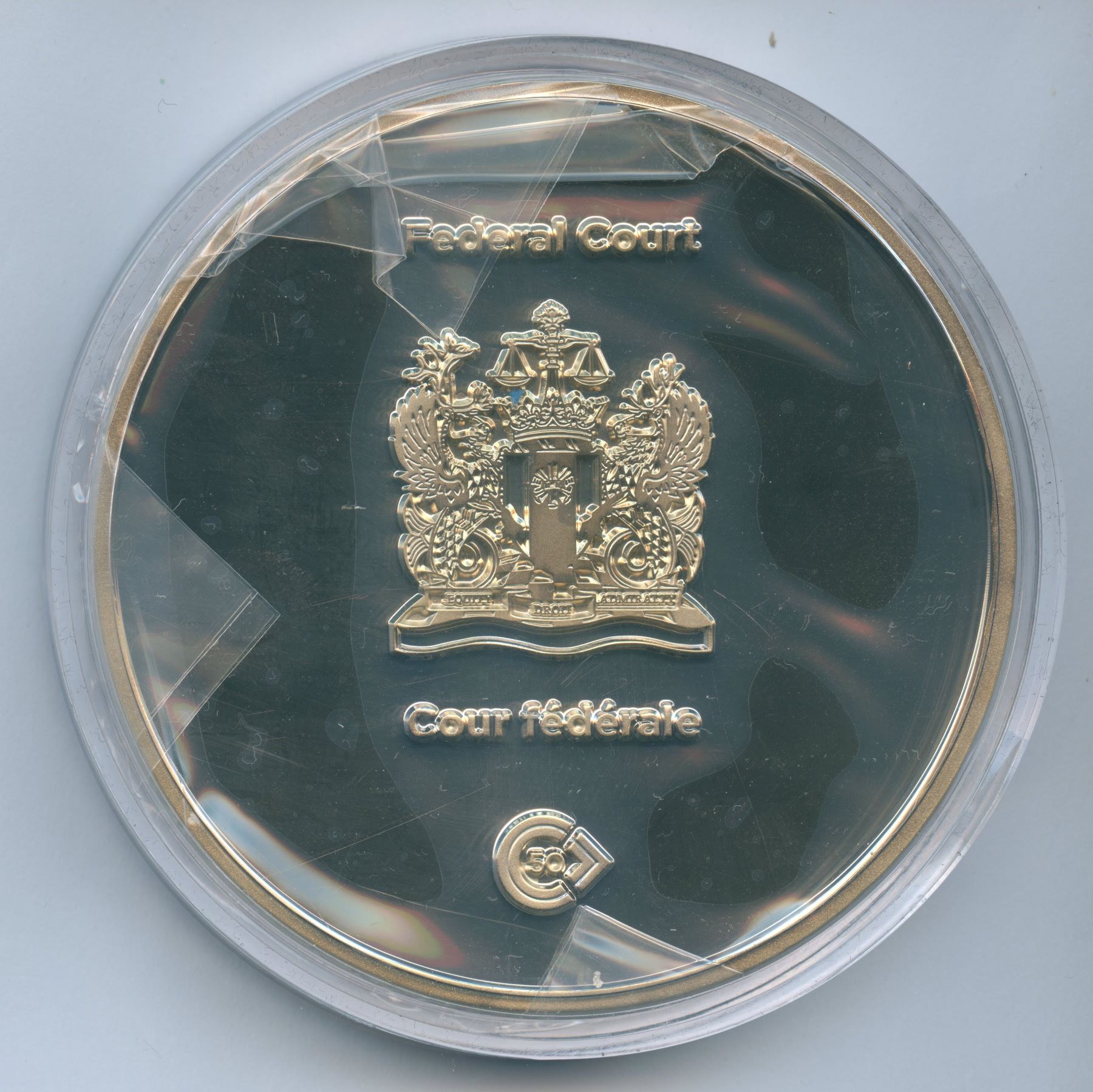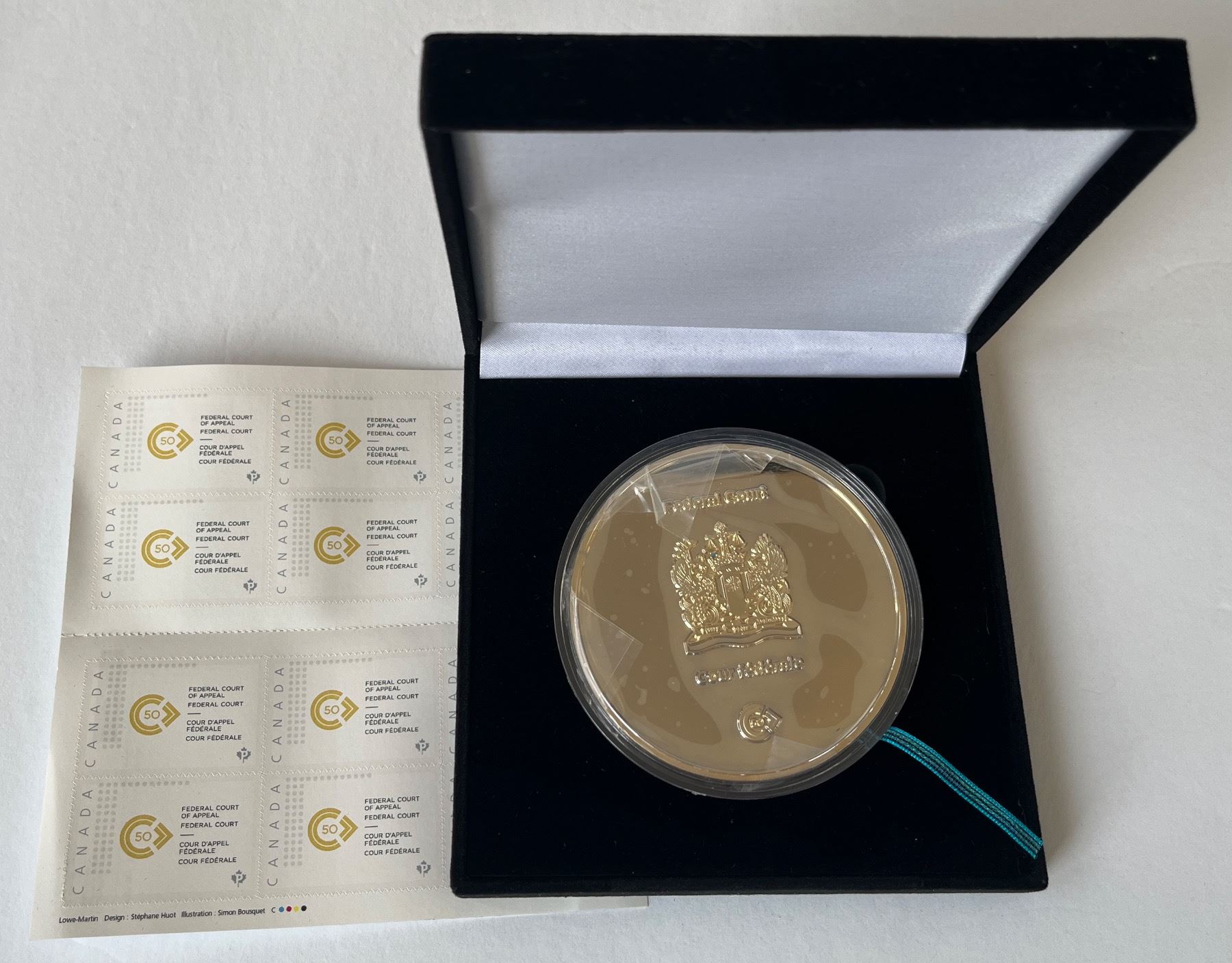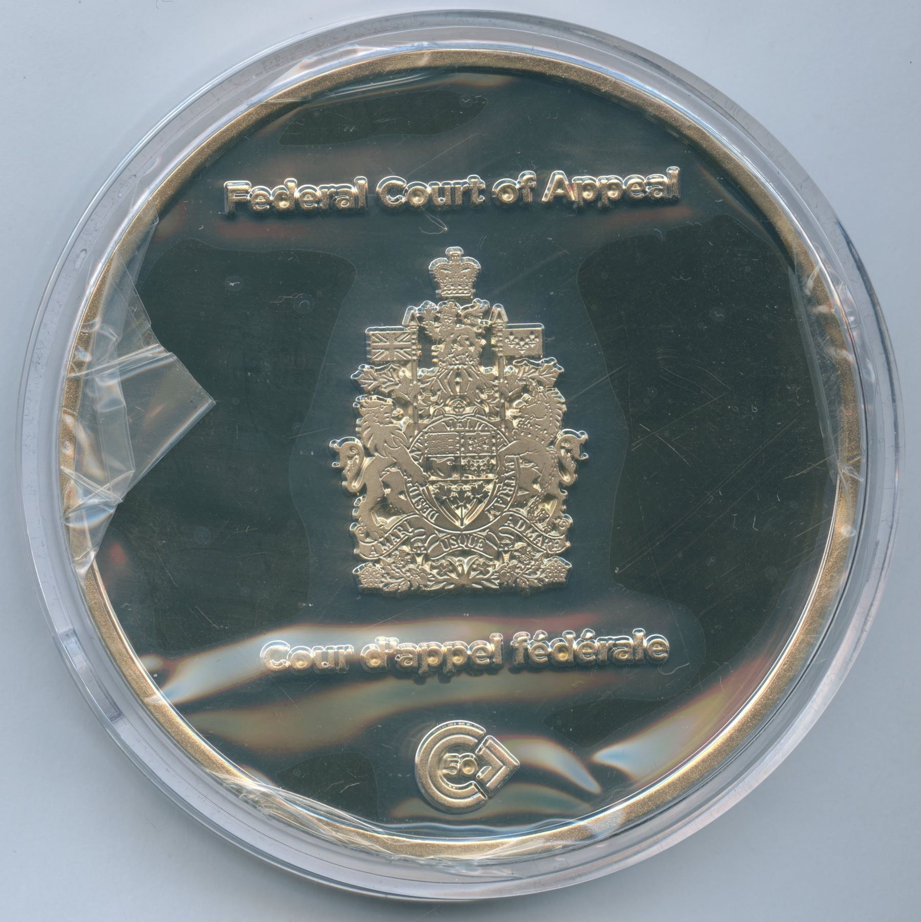Commemoration of the 50th Anniversary of the Federal Court of Appeal - Federal Court / Cour d'appel fédérale - Cour fédérale in Canada from 1921 - 1971. Medal in presentation box and come with the Canada Post commemorative post stamp booklet. First time handling this medal. 76 mm and 111 grams. XRF composition of Ni, Cu & Zn.