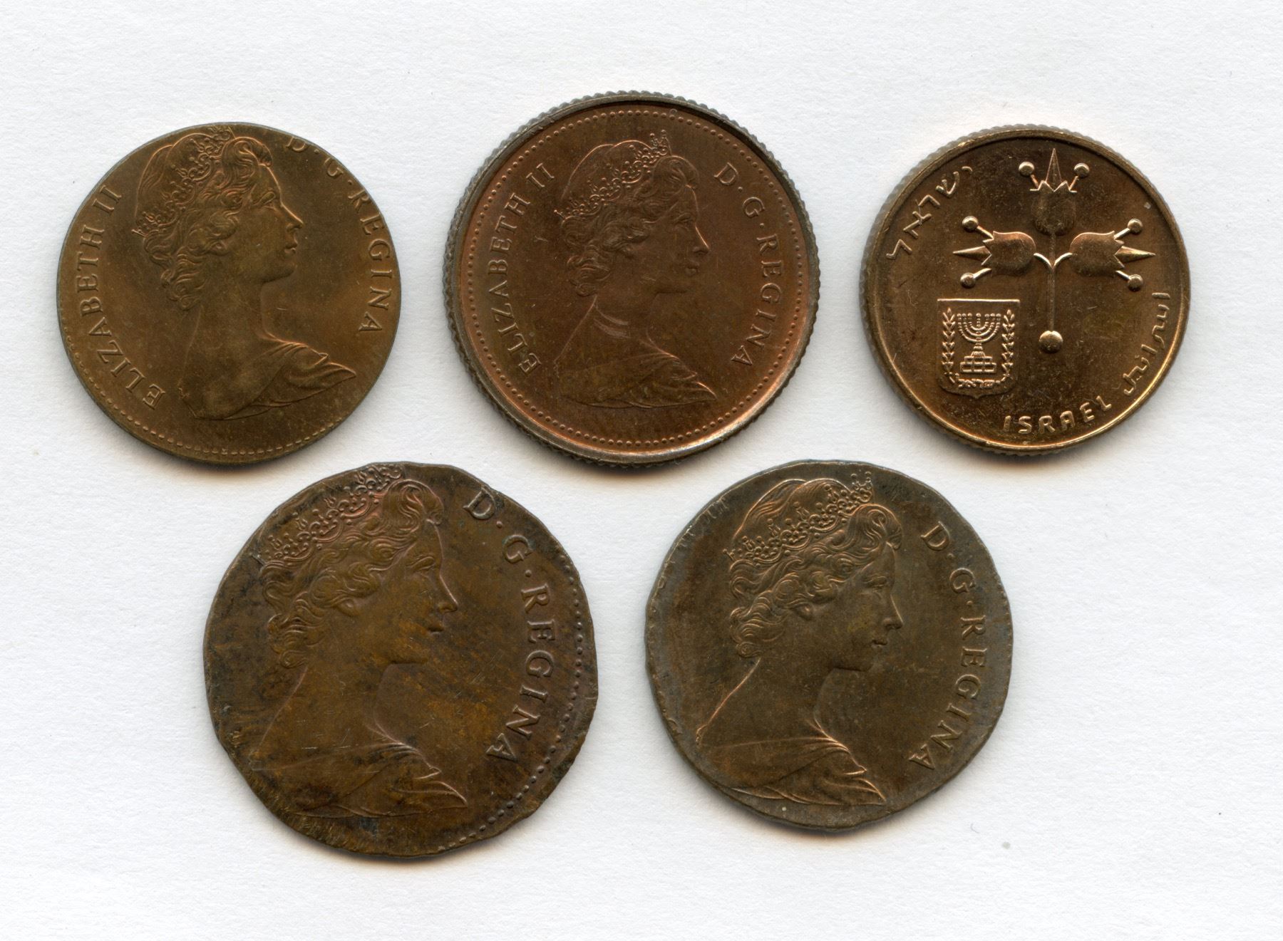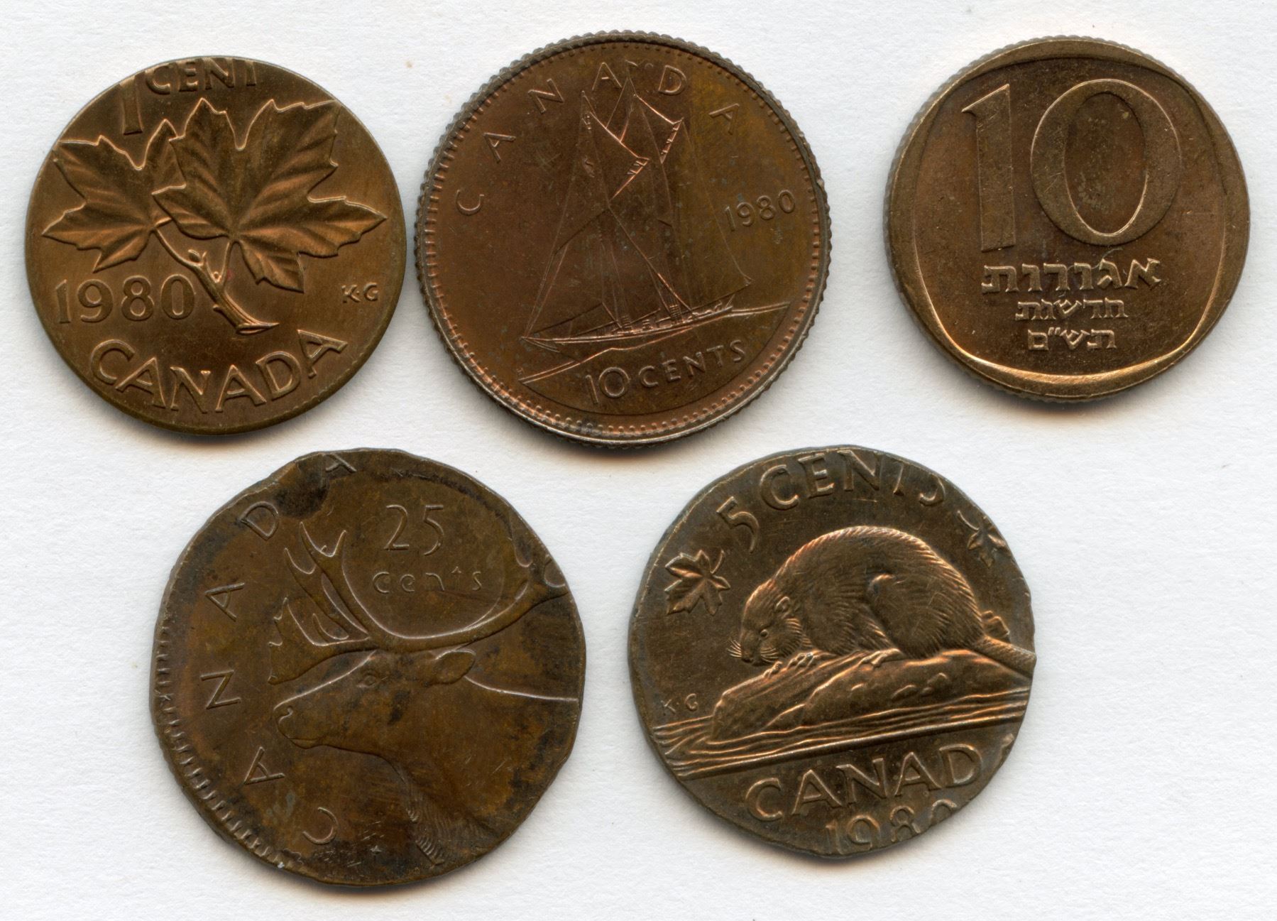 A unique set of multiple Canadian denominations (1c, 5c, 10c, 25c) all struck on Israel 10 New Agorot bronze planchets. All planchets destined to be struck for the 10 New Agorot were Type 1 planchets, which you can see on the 1c, 5c and 25c coins (the 10c is reeded). Three coins are dated 1980 and the 25c is undated. Four off-country/off-metal errors in total, and this set is likely unique. An Israel 10 New Agorot (KM #108) is also provided as a reference. Patrick Glassford Collection.
